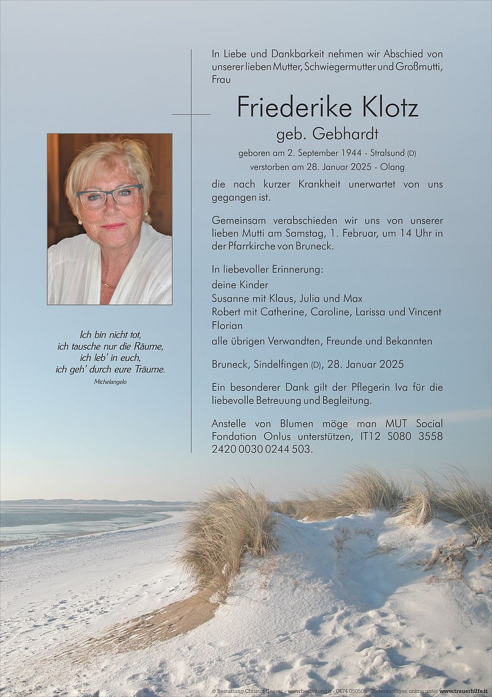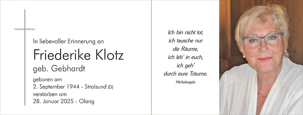 Anstelle von Blumen möge man MUT Social Fondation Onlus unterstützen, IT12 S080 3558 2420 0030 0244 503.