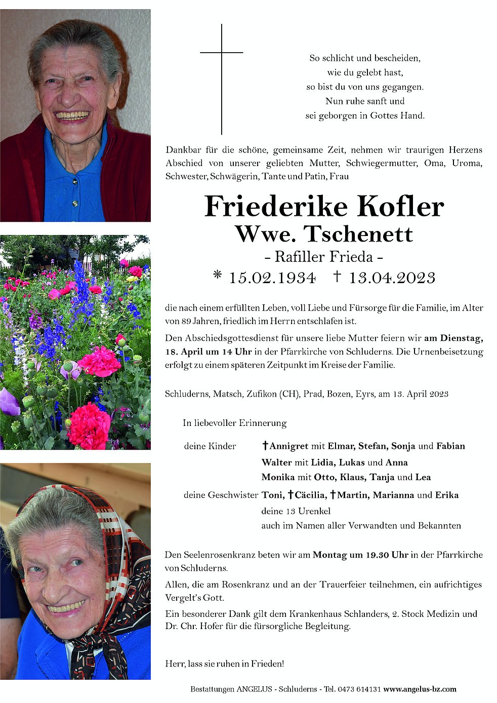 Liebe Monika mit Trauerfamilie .....wenn sich's Mutter's Augen schließen ,die nun Ruhn, aber einst so viel geschafft,still und leise eure Tränen fließen,ein geliebtes gutes Mutterherz wird zur letzten Ruh gebracht...... mein aufrichtiges Beileid den Hinterbliebenen ... Herr lass sie Ruhen in Frieden...AMEN....