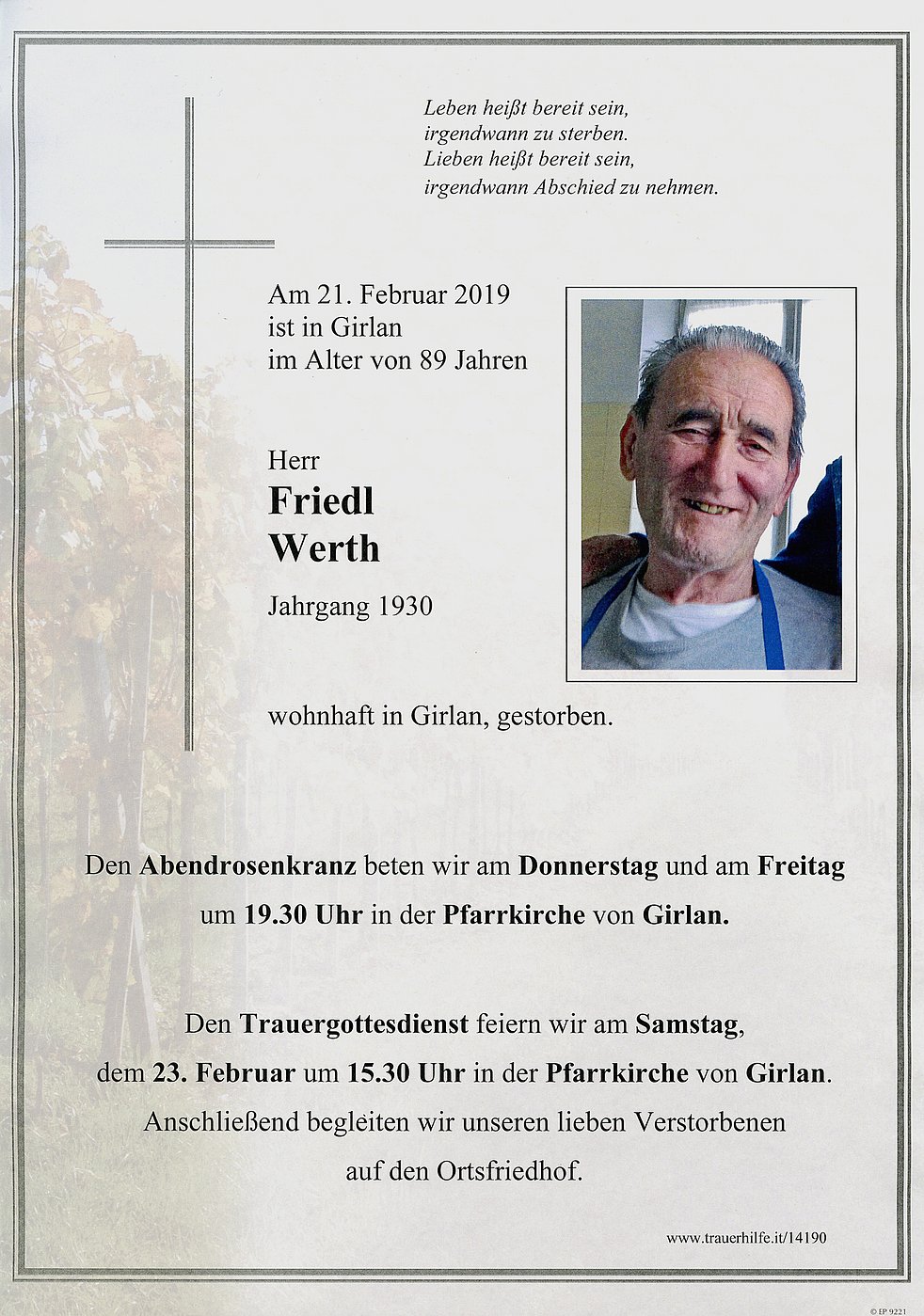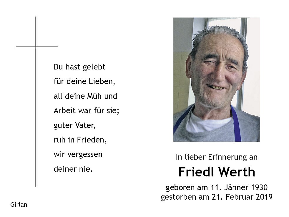 Den Trauergottesdienst feiern wir am Samstag dem 23. Februar um 15.30 Uhr in der Pfarrkirche von Girlan. Anschließend begleiten wir unseren lieben Verstorbenen auf den Ortsfriedhof.