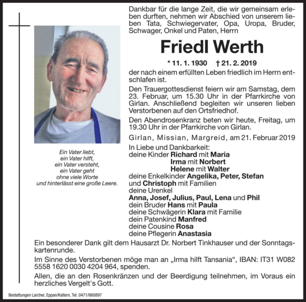 Im Sinne des Verstorbenen möge man an Irma hilft Tansania, IBAN: IT31W 08255 58162 000304204964 spenden.