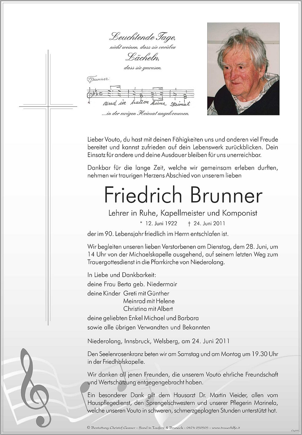 Ein besonderer Dank gilt dem Hausarzt Dr. Martin Vieider, allen vom Hauspflegedienst, den Sprengelschwestern und unserer Pflegerin Marinela, welche unseren Vouto in schweren, schmerzgeplagten Stunden unterstützt hat.