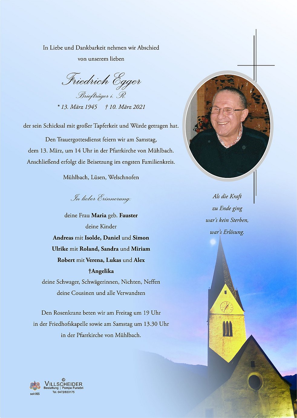 Wenig ist es, das wir sagen oder tun können, doch wisse, das wir in Gedanken Euch nahe sind. Das ewige Licht leuchte Ihm. Ruhe in Frieden Friedl. Viel Kraft Maria. Psenner E. Villnöß