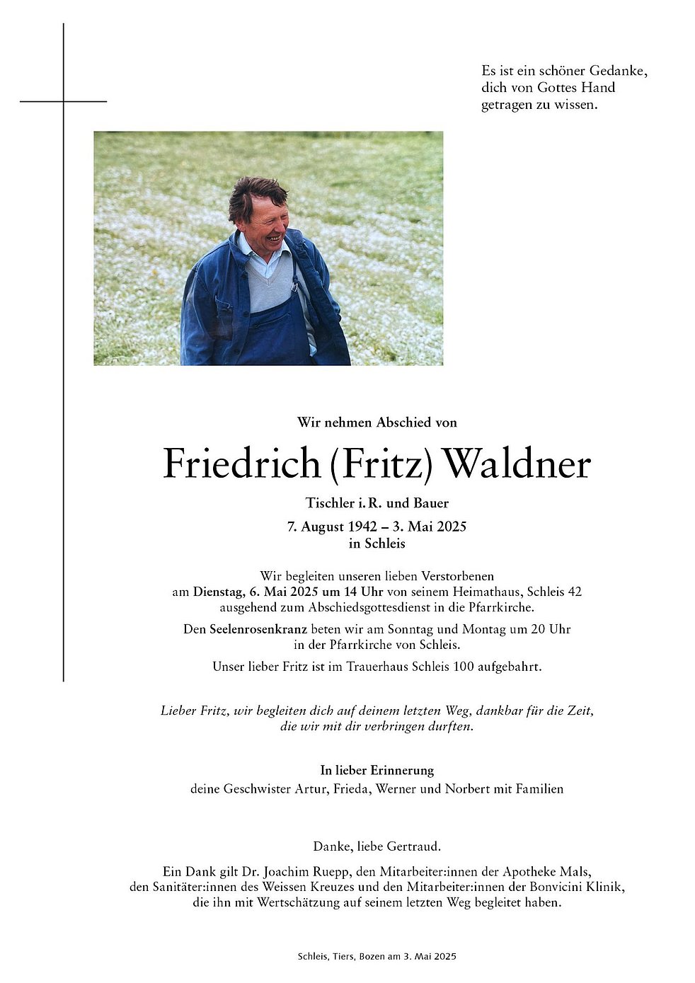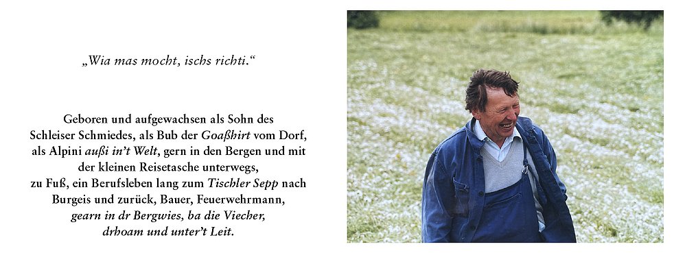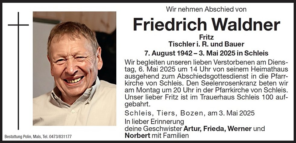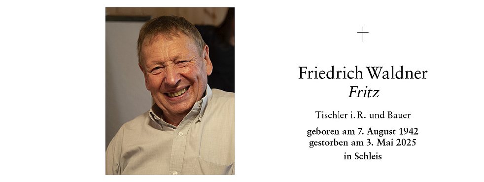 Lieber Fritz, du warst als einer der Gründerväter der Schleiser Jugendgruppe, eine vorbildliche Leitfigur und ein vielfältiger Ideengeber. Die Begeisterung für die Natur, für das Bergsteigen und für das Wandern hast du bei vielen geweckt. Durch deinen täglichen Fußmarsch nach Burgeis über Jahre hindurch warst du durchtrainiert, jedoch wir konnten nicht Schritt halten. Durch deine Nachsicht und durch dein gutes Zureden kamen wir dann auch weiter. Dein Verständnispotential war enorm. Mit Leichtigkeit hast du uns die rätoromanischen Bezeichnungen für Berggipfel, Flurnamen, Höfe und Täler näher gebracht. Für die Bergmärsche, vor allem für den "Annaberger-Marsch" in den 70er Jahren, schlugst du die Werbetrommel und eine Truppe war bald zusammen. Der Wanderpokal, mit Fritz an der Spitze, war das begehrteste Ziel. Auch die Feiern beim "Alten Haus" bleiben unvergessen. Und so manche Idee wurde dort geschmiedet. Beim Binden der Adventkränze in der "Schmitt", beim Brautsingen, beim Neujahrsingen, bei Diskussionrunden...Fritz war immer mit Rat und Tat dabei. Sein feines, wohlwollendes Schmunzeln und sein Augenzwinkern werden uns lange in Erinnerung bleiben.