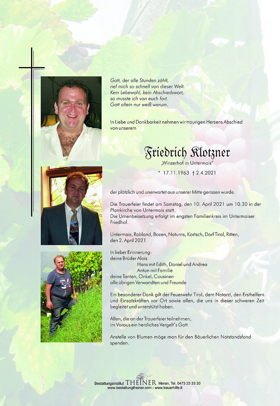 Die Trauerfeier findet am Samstag, den 10. April 2021 um 10.30 in der Pfarrkirche von Untermais statt.