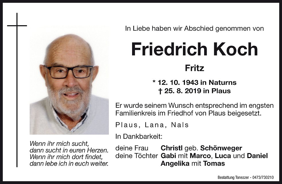 Er wurde seinem Wunsch entsprechend im engsten Familienkreis im Friedhof von Plaus beigesetzt.
