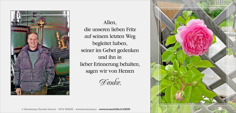 Ein besonderer Dank gilt den Ärzten und dem Pflegepersonal der Abteilung HNO am Krankenhaus Brixen, dem Team vom Sanitäts- und Sozialsprengel St. Lorenzen und dem ehemaligen Hausarzt Herrn Dr. Oswald Thalmann.