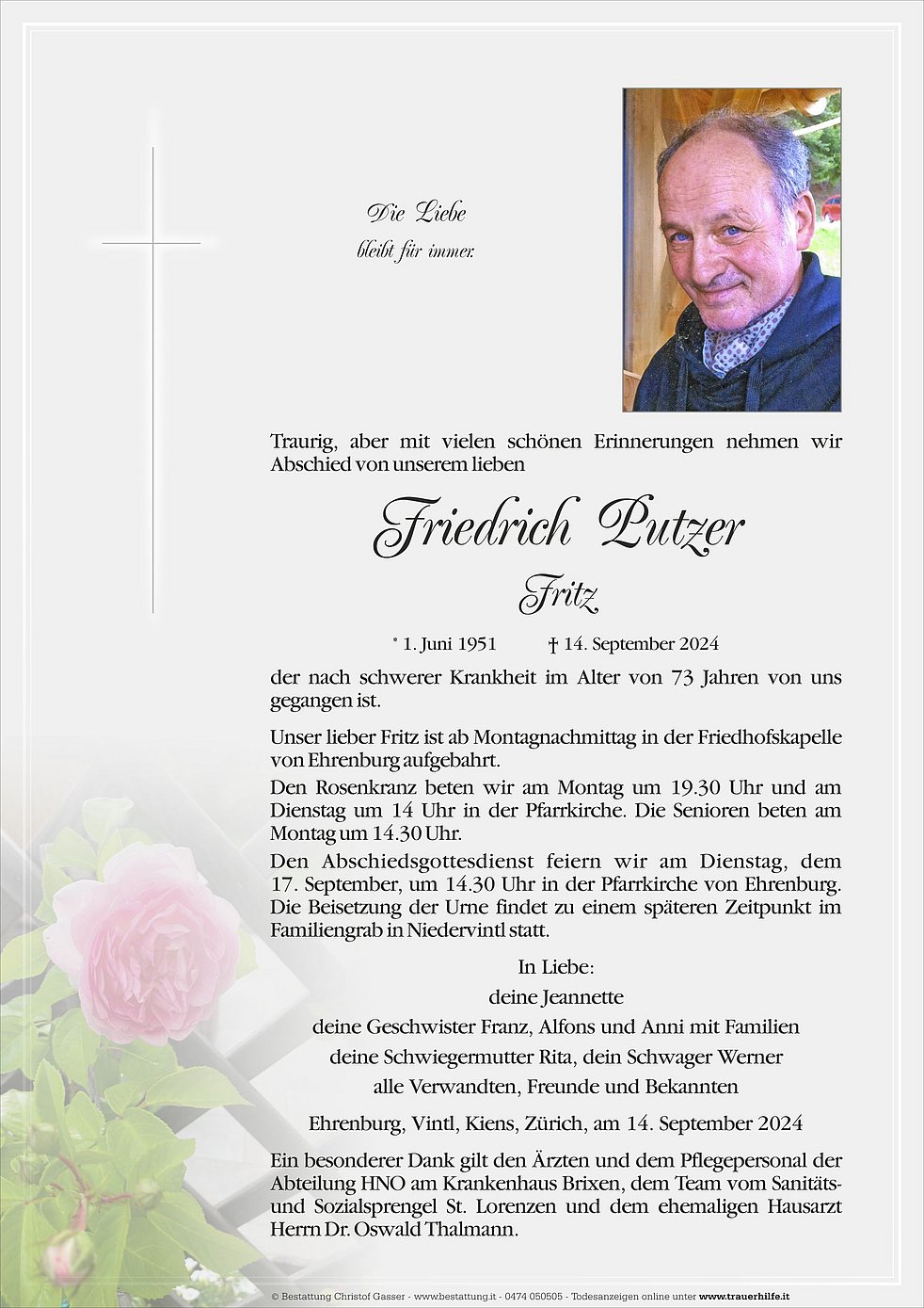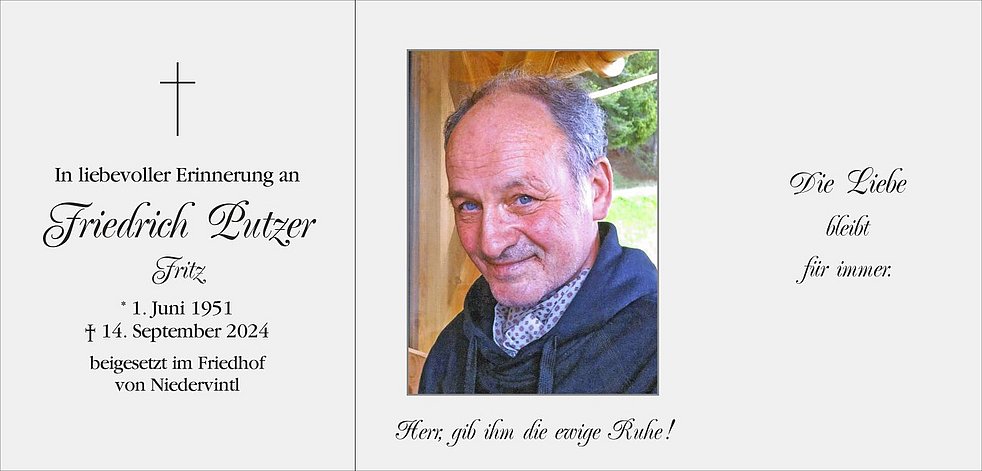 17. September, um 14.30 Uhr in der Pfarrkirche von Ehrenburg. Die Beisetzung der Urne findet zu einem späteren Zeitpunkt im Familiengrab in Niedervintl statt.