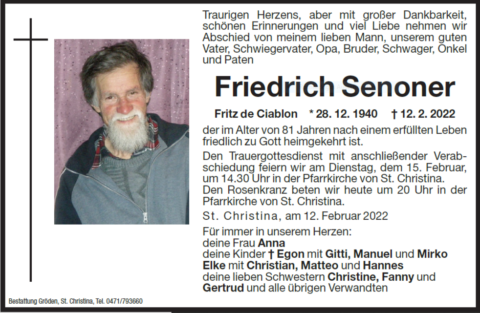 Den Trauergottesdienst mit anschließender Verabschiedung feiern wir am Dienstag, dem 15. Februar, um 14.30 Uhr in der Pfarrkirche von St. Christina.