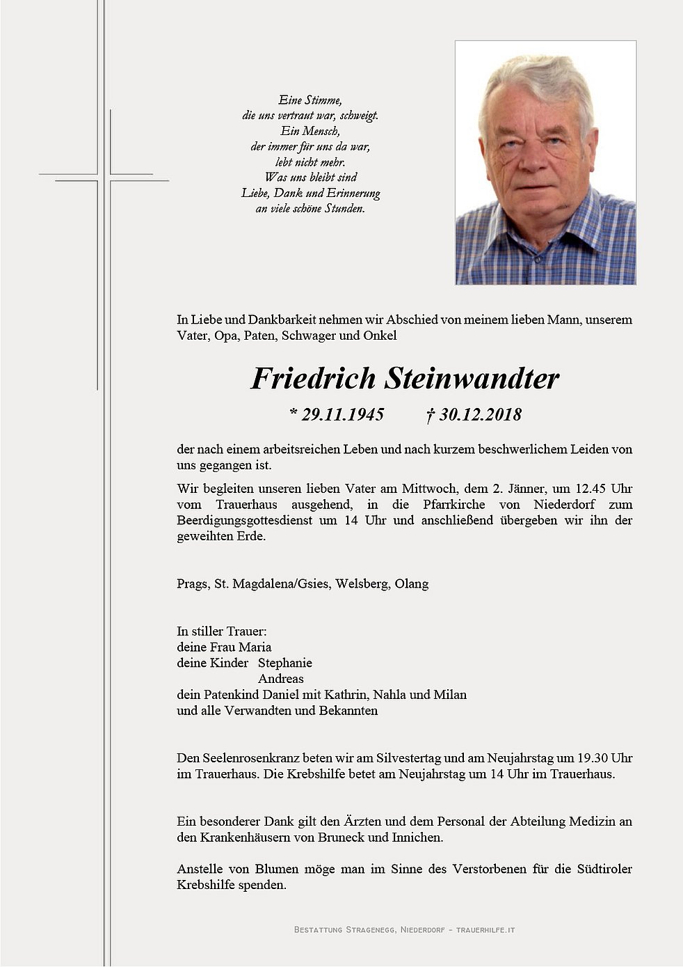 Wir begleiten unseren lieben Vater am Mittwoch, dem 2. Jänner, um 12.45 Uhr vom Trauerhaus ausgehend, in die Pfarrkirche von Niederdorf zum Beerdigungsgottesdienst um 14 Uhr und anschließend übergeben wir ihn der geweihten Erde.