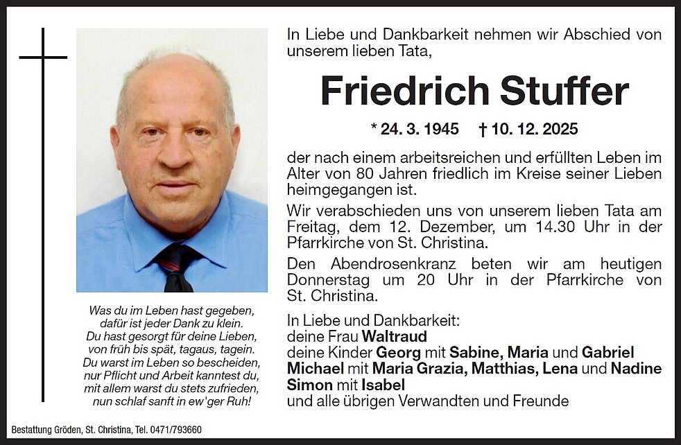 Wir verabschieden uns von unserem lieben Tata am Freitag, dem 12. Dezember, um 14.30 Uhr in der Pfarrkirche von St. Christina.