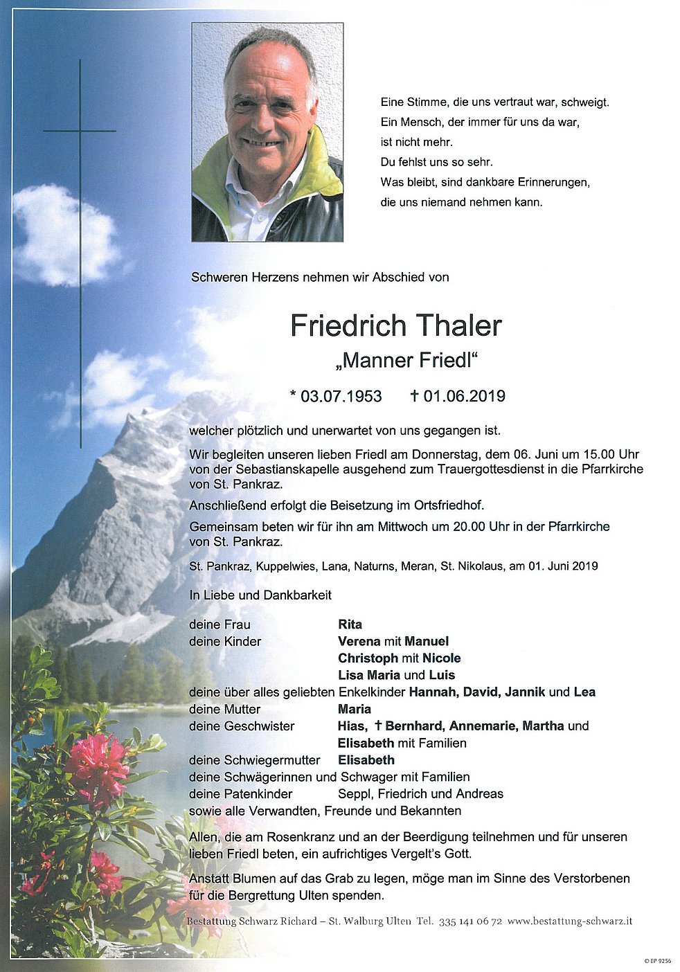 Danke das I di hon derft kennen learnen. Du bisch mir oft mit Rat und Tat zur Seite gstondn als junger Rettungsstellenleiter der Bergrettung Latsch. Mir hobn ins oftramol über Gott und die Welt unterholtn und wos bleibt isch deine Leidenschaft für die Berge und die Bergrettung. Wear die ollm in guater Erinnerung holtn. Worsch ein Vorbild. Ruhe in Frieden.