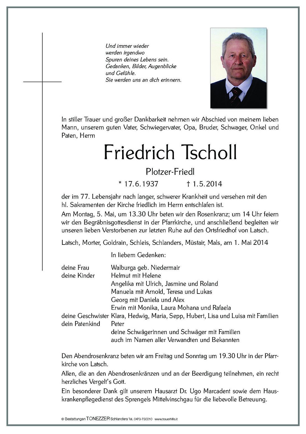 Und immer wieder werden irgendwo Spuren deines Lebens sein. Gedanken, Bilder, Augenblicke und Gefühle. Sie werden uns an dich erinnern. In stiller Trauer und großer Dankbarkeit nehmen wir Abschied von meinem lieben Mann, unserem guten Vater, Schwiegervater, Opa, Bruder, Schwager, Onkel und Paten, Herrn Friedrich Tscholl Plotzer-Friedl * 17.6.1937 † 1.5.2014 der im 77. Lebensjahr nach langer, schwerer Krankheit und versehen mit den hl. Sakramenten der Kirche friedlich im Herrn entschlafen ist. Am Montag, 5. Mai, um 13.30 Uhr beten wir den Rosenkranz; um 14 Uhr feiern wir den Begräbnisgottesdienst in der Pfarrkirche und anschließend begleiten wir unseren lieben Verstorbenen zur letzten Ruhe auf den Ortsfriedhof von Latsch. Latsch, Morter, Goldrain, Schleis, Schlanders, Müstair, Mals, am 1. Mai 2014 In liebem Gedenken: deine Frau Walburga geb. Niedermair deine Kinder Helmut mit Helene Angelika mit Ulrich, Jasmine und Roland Manuela mit Arnold, Teresa und Lukas Georg mit Daniela und Alex Erwin mit Monika, Laura Mohana und Rafaela deine Geschwister Klara, Hedwig, Maria, Sepp, Hubert, Lisa und Luisa mit Familien dein Patenkind Peter deine Schwägerinnen und Schwäger mit Familien auch im Namen aller Verwandten und Bekannten Den Abendrosenkranz beten wir am Freitag und Sonntag um 19.30 Uhr in der Pfarrkirche von Latsch. Allen, die an den Abendrosenkränzen und an der Beerdigung teilnehmen, ein recht herzliches Vergelt’s Gott. Ein besonderer Dank gilt unserem Hausarzt Dr. Ugo Marcadent sowie dem Hauskrankenpflegedienst des Sprengels Mittelvinschgau für die liebevolle Betreuung.