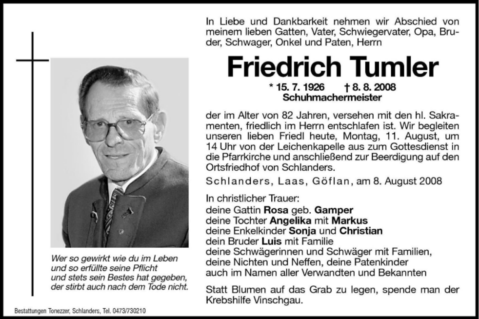 Wir begleiten unseren lieben Friedl am Montag, 11. August, um 14 Uhr von der Leichenkapelle aus zum Gottesdienst in die Pfarrkirche und anschließend zur Beerdigung auf den Ortsfriedhof von Schlanders.