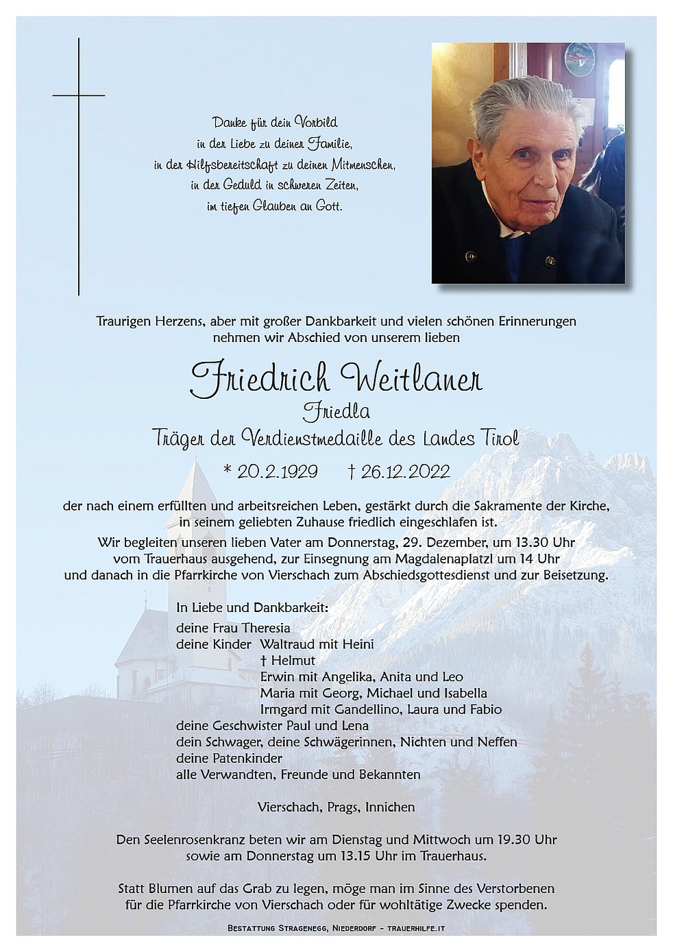 Wir begleiten unseren lieben Vater am Donnerstag, 29. Dezember, um 13.30 Uhr vom Trauerhaus ausgehend, zur Einsegnung am Magdalenaplatzl um 14 Uhr und danach in die Pfarrkirche von Vierschach zum Abschiedsgottesdienst und zur Beisetzung.