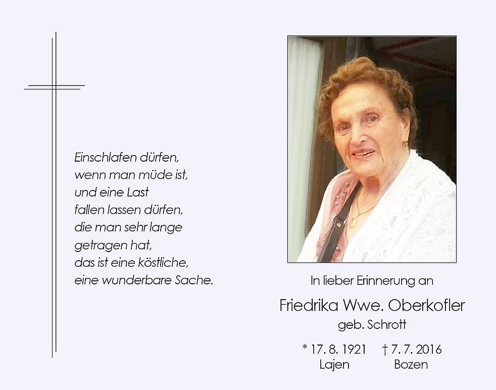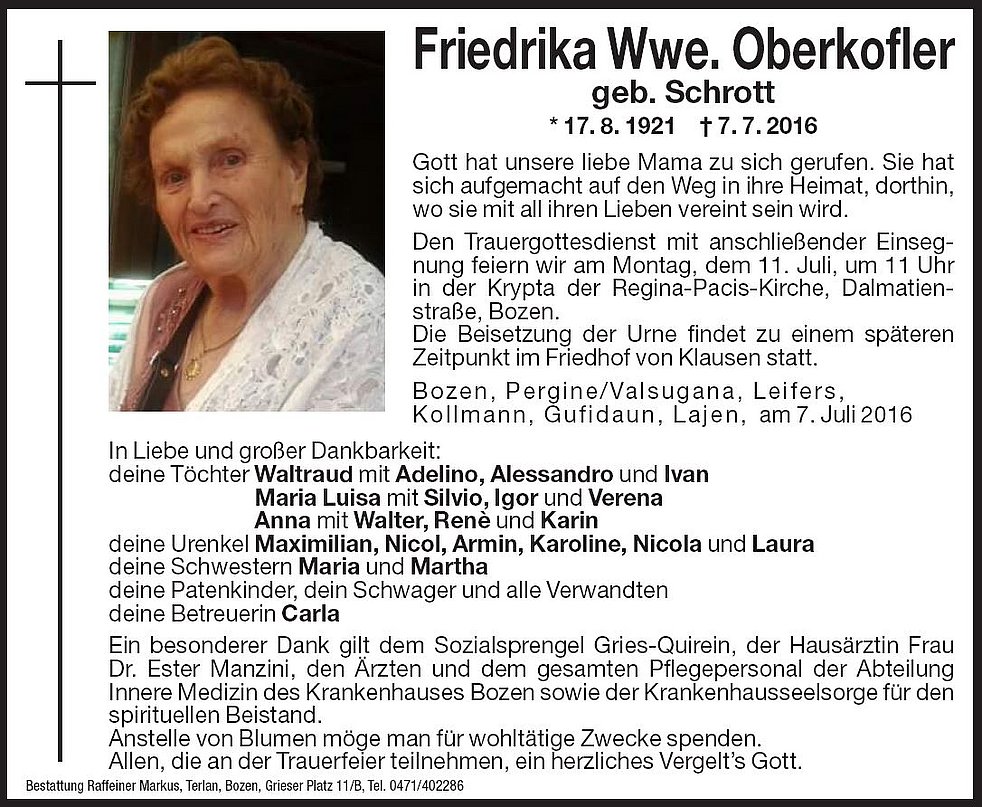 Ein besonderer Dank gilt dem Sozialsprengel Gries-Quirein, der Hausärztin Frau Dr. Ester Manzini, den Ärzten und dem gesamten Pflegepersonal der Abteilung Innere Medizin des Krankenhauses Bozen sowie der Krankenhauseelsorge für den spirituellen Beistand.