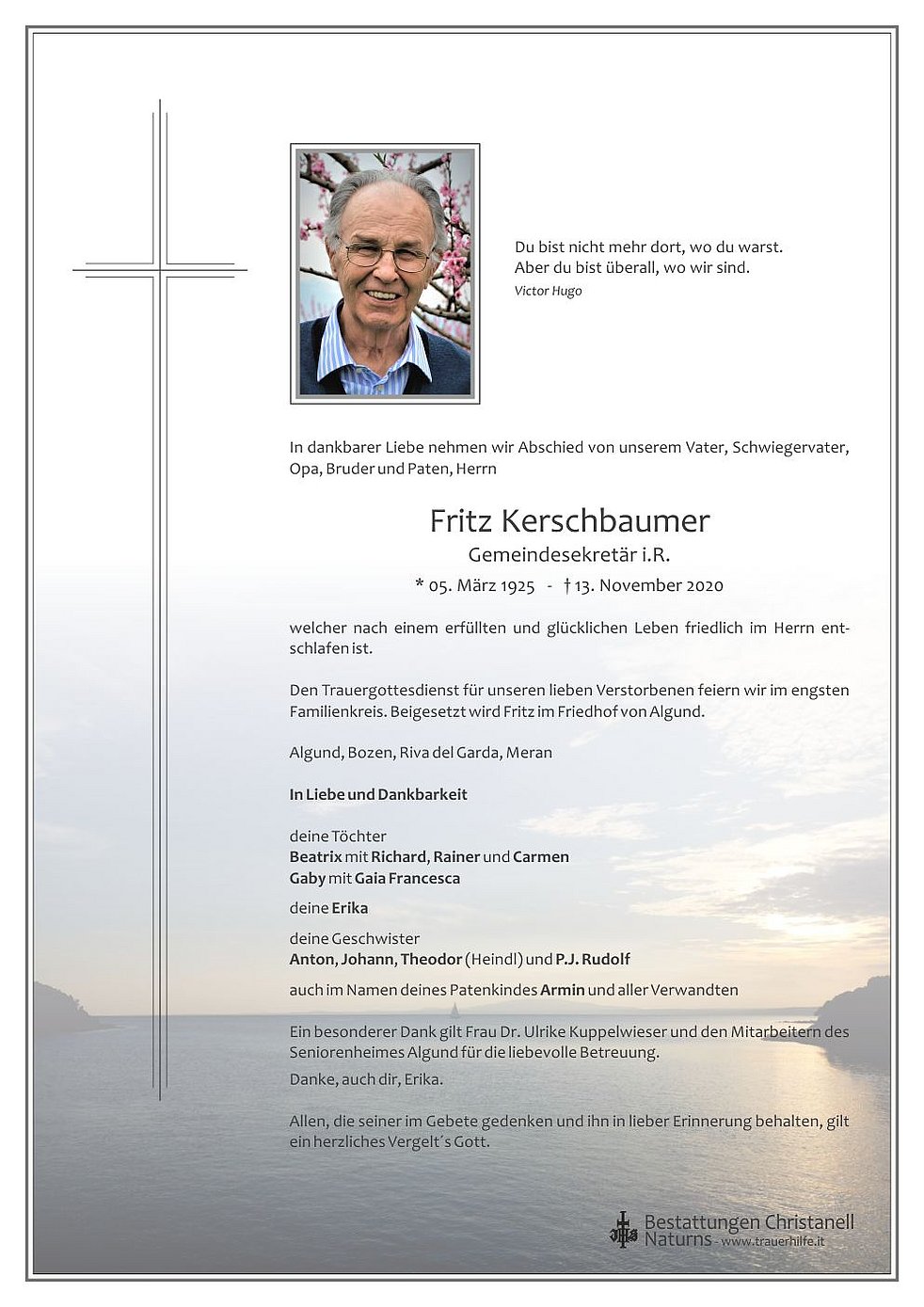 Den Trauergottesdienst für unseren lieben Verstorbenen feiern wir im engsten Familienkreis. Beigesetzt wird Fritz im Friedhof von Algund.