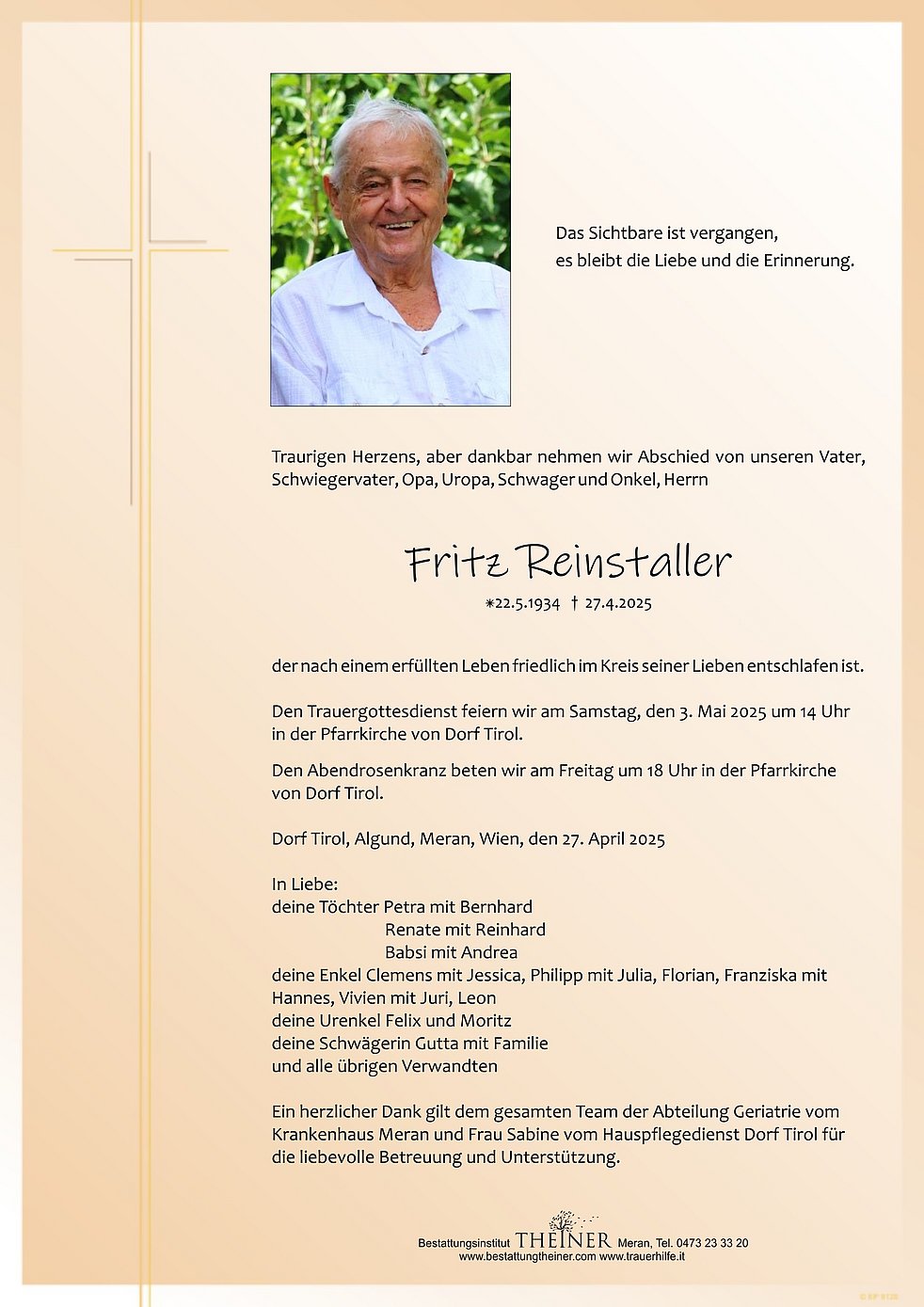 Den Trauergottesdienst feiern wir am Samstag, den 3. Mai 2025 um 14 Uhr in der Pfarrkirche von Dorf Tirol.
