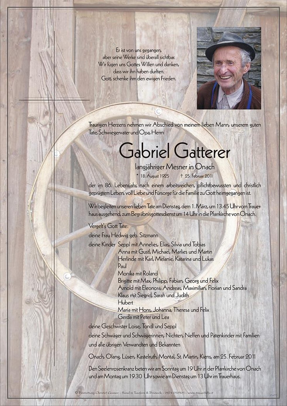 Wir begleiten unseren lieben Tate am Dienstag, dem 1. März, um 13.45 Uhr vom Trauer-haus ausgehend, zum Begräbnisgottesdienst um 14 Uhr in die Pfarrkirche von Onach.
