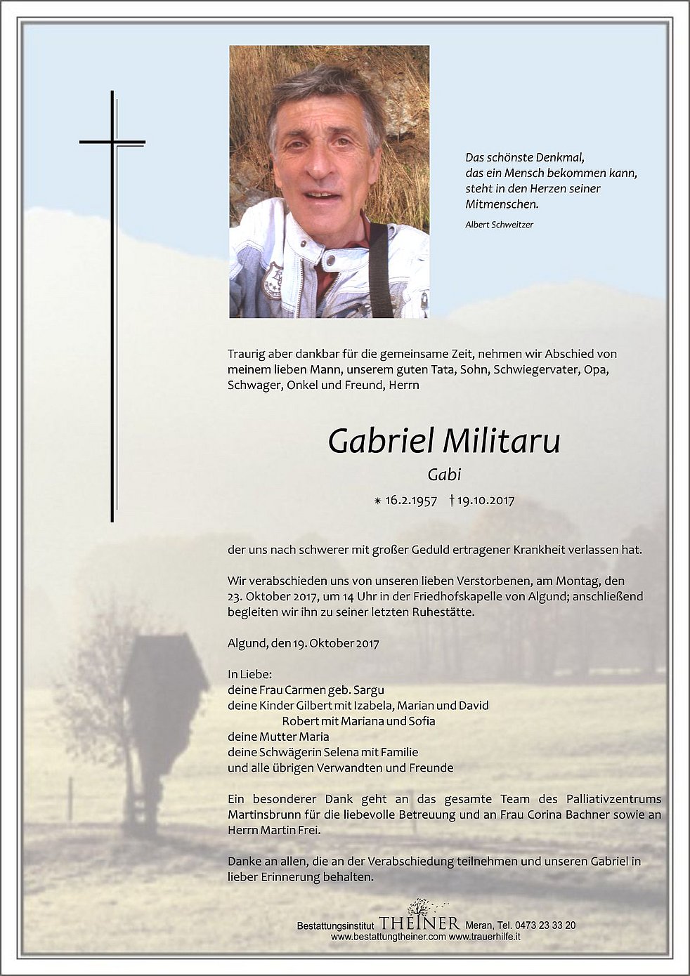 Wir verabschieden uns von unseren lieben Verstorbenen, am Montag, den 23. Oktober 2017, um 14 Uhr in der Friedhofskapelle von Algund; anschließend begleiten wir ihn zu seiner letzten Ruhestätte.
