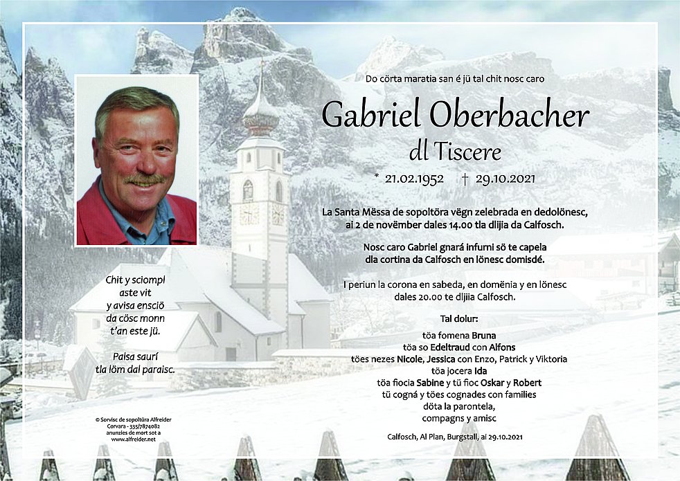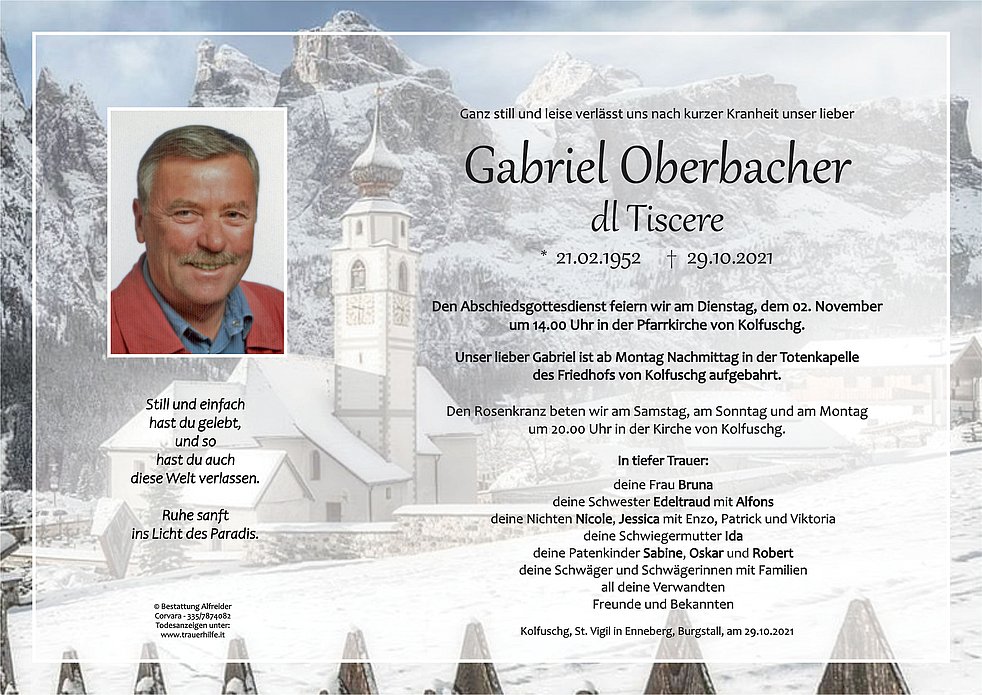 Unser lieber Gabriel ist ab Montag Nachmittag in der Totenkapelle des Friedhofs von Kolfuschg aufgebahrt.