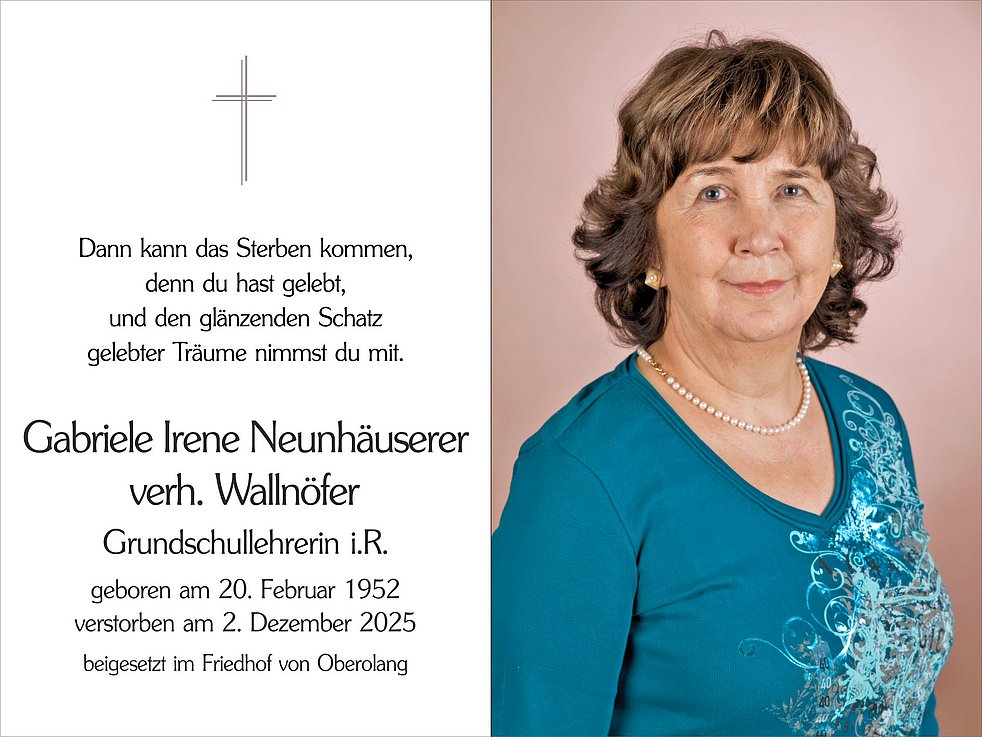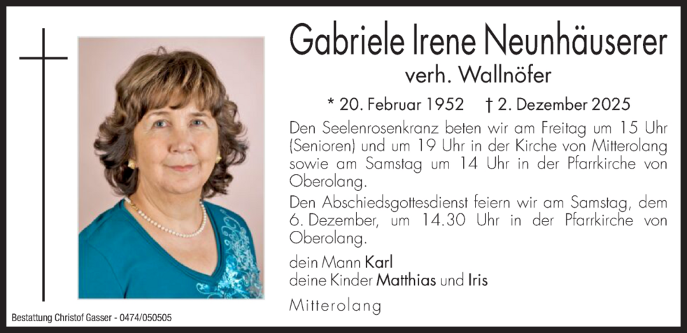 Den Abschiedsgottesdienst feiern wir am Samstag, dem 6. Dezember, um 14.30 Uhr in der Pfarrkirche von Oberolang. Anschließend begleiten wir sie zur Beisetzung in den Ortsfriedhof.