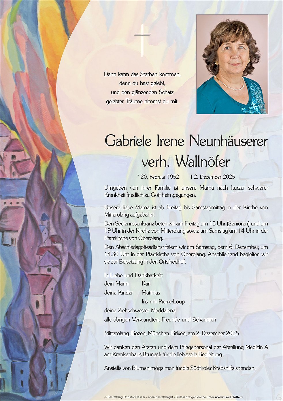 Anstelle von Blumen möge man für die Südtiroler Krebshilfe spenden.