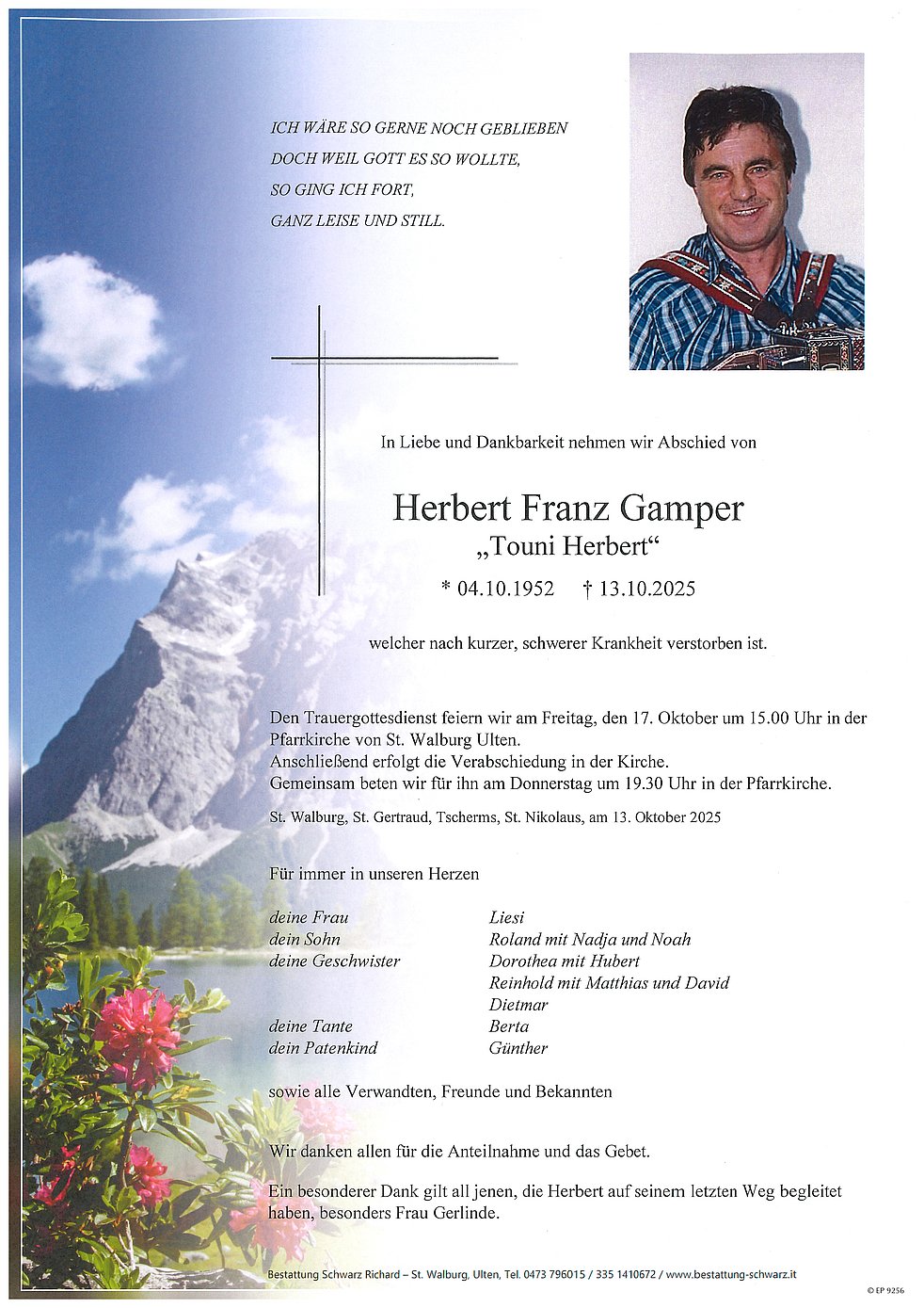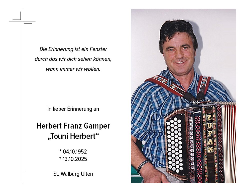 Den Trauergottesdienst feiern wir am Freitag, den 17. Oktober um 15.00 Uhr in der Pfarrkirche von St. Walburg Ulten. Anschließend erfolgt die Verabschiedung in der Kirche.