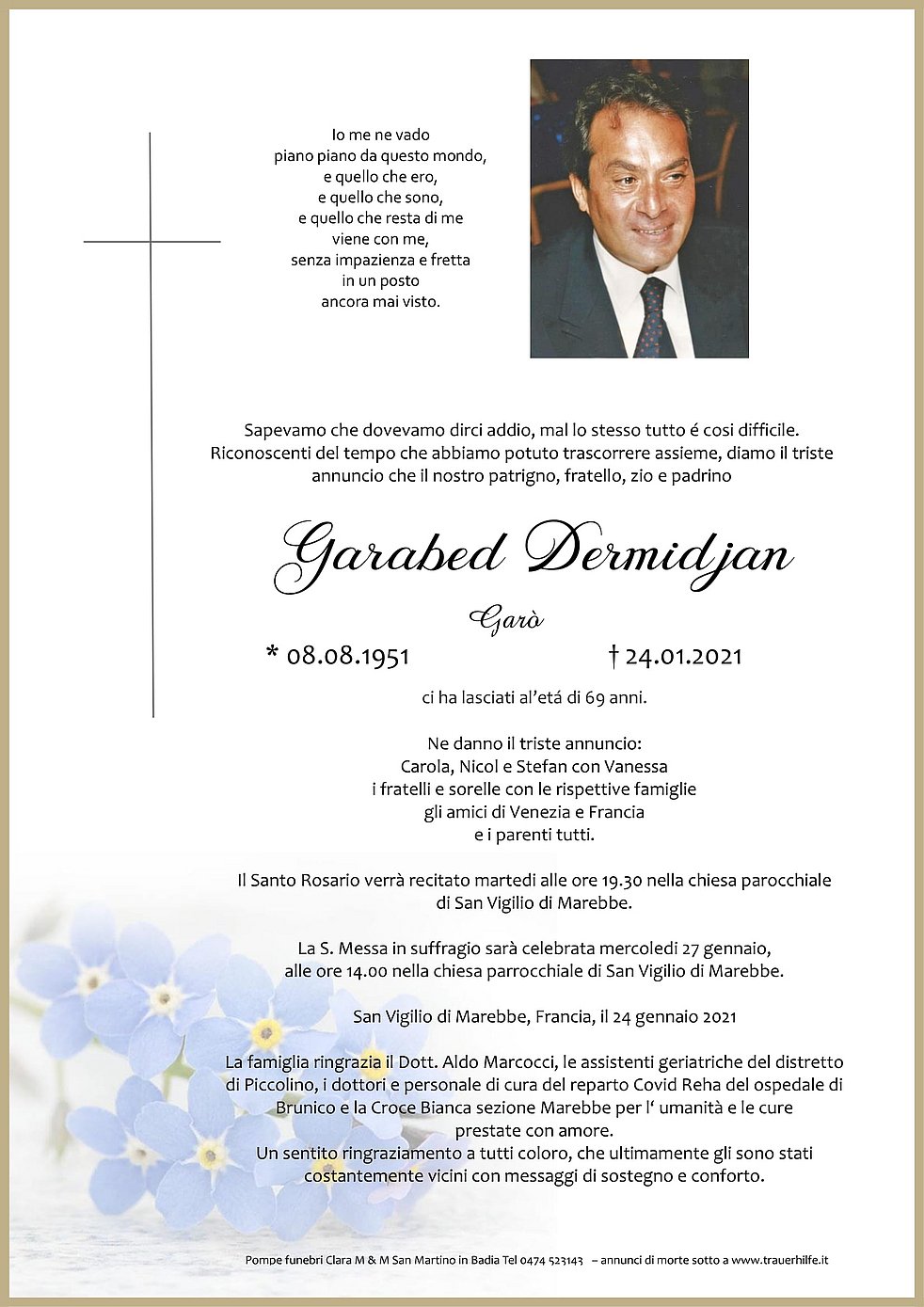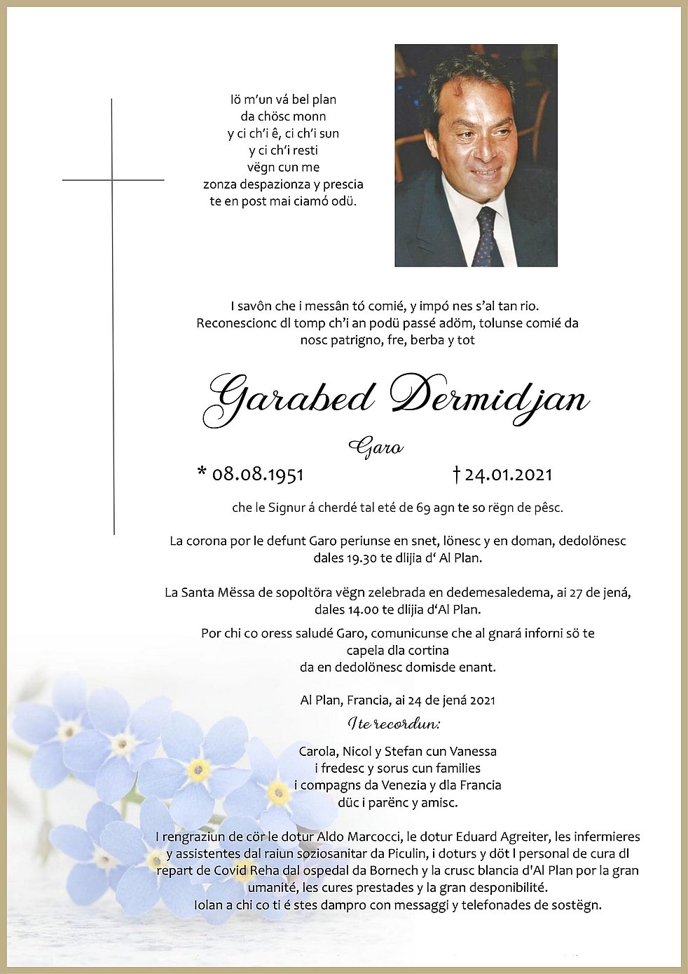 La famiglia ringrazia il Dott. Aldo Marcocci, le assistenti geriatriche del distretto di Piccolino, i dottori e personale di cura del reparto Covid Reha del ospedale di Brunico e la Croce Bianca sezione Marebbe per l‘ umanità e le cure prestate con amore.