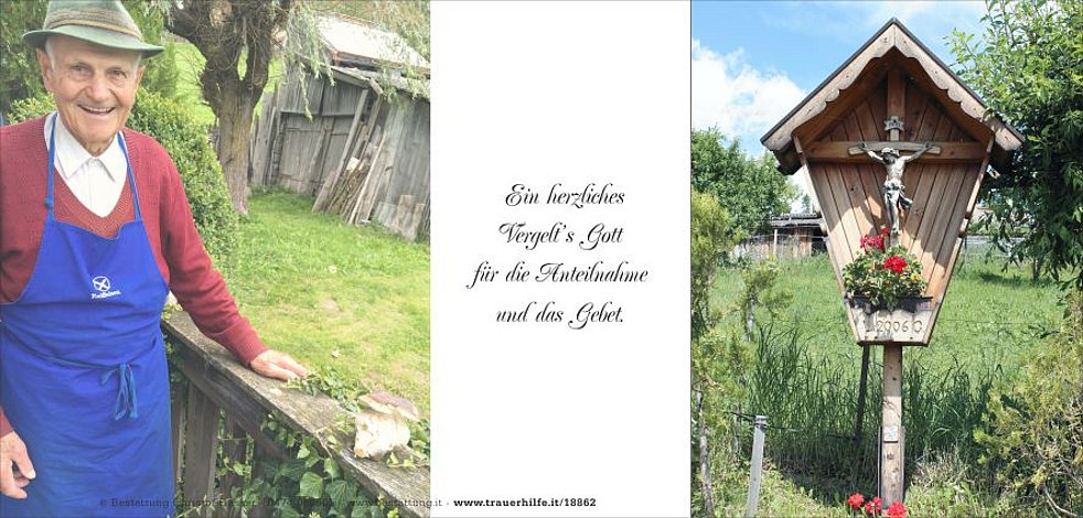 Unser Onkel ist in der Friedhofskapelle aufgebahrt. Den Seelenrosenkranz beten wir am Samstag um 18.30 Uhr, am Sonntag um 14 Uhr und um 18.30 Uhr sowie am Montag um 14.30 Uhr in der Pfarrkirche.