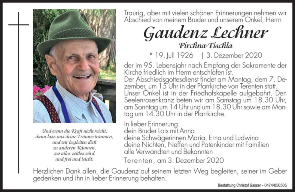 Der Abschiedsgottesdienst findet am Montag, dem 7. Dezember, um 15 Uhr in der Pfarrkirche von Terenten statt.
