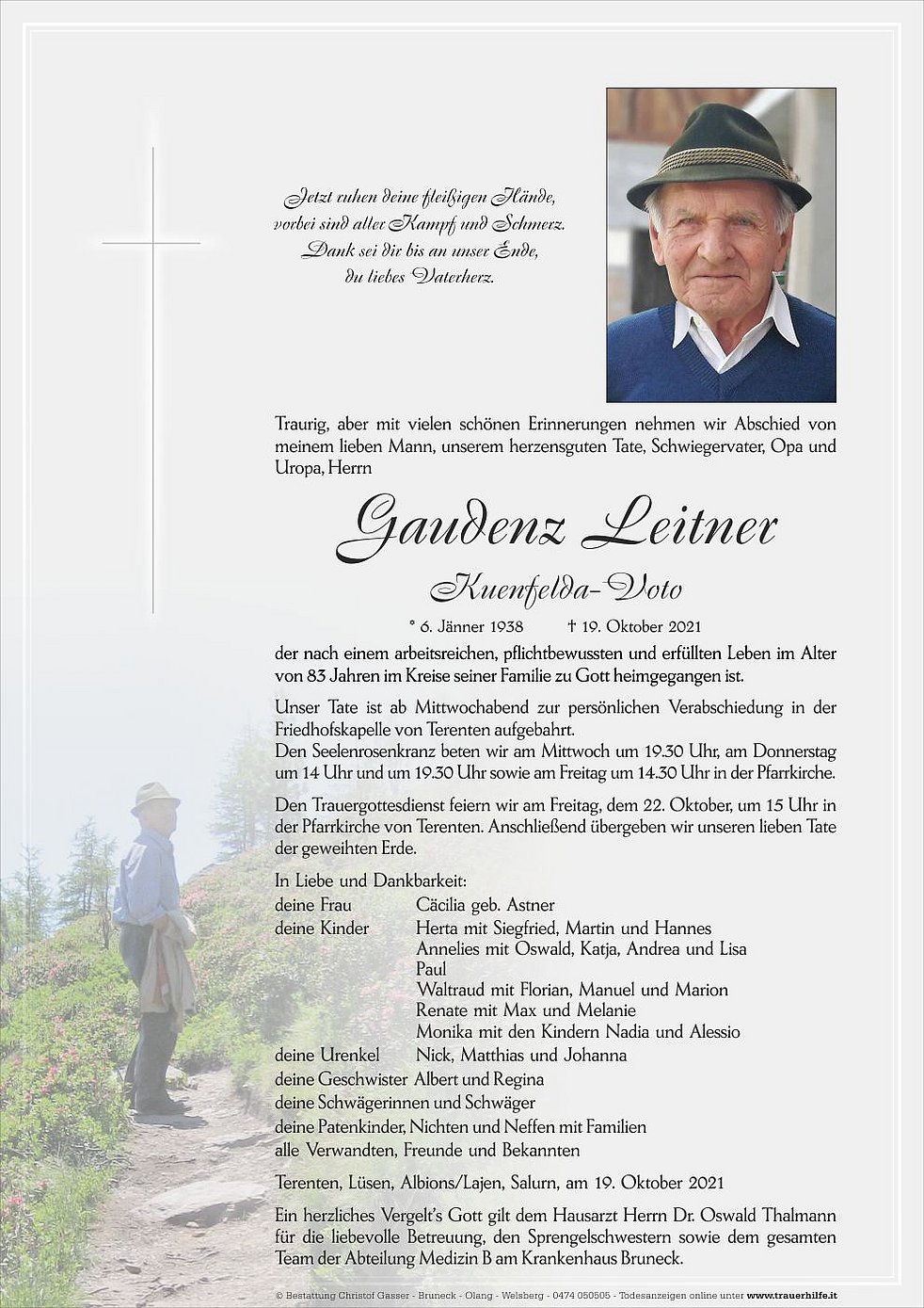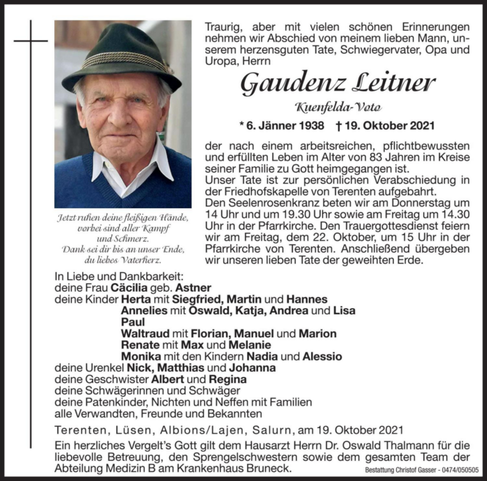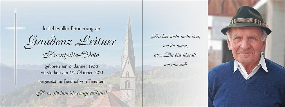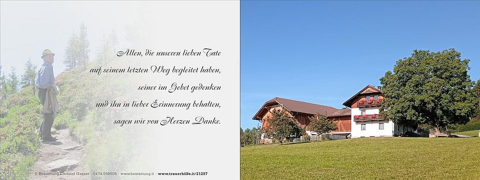 Den Trauergottesdienst feiern wir am Freitag, dem 22. Oktober, um 15 Uhr in der Pfarrkirche von Terenten. Anschließend übergeben wir unseren lieben Tate der geweihten Erde.