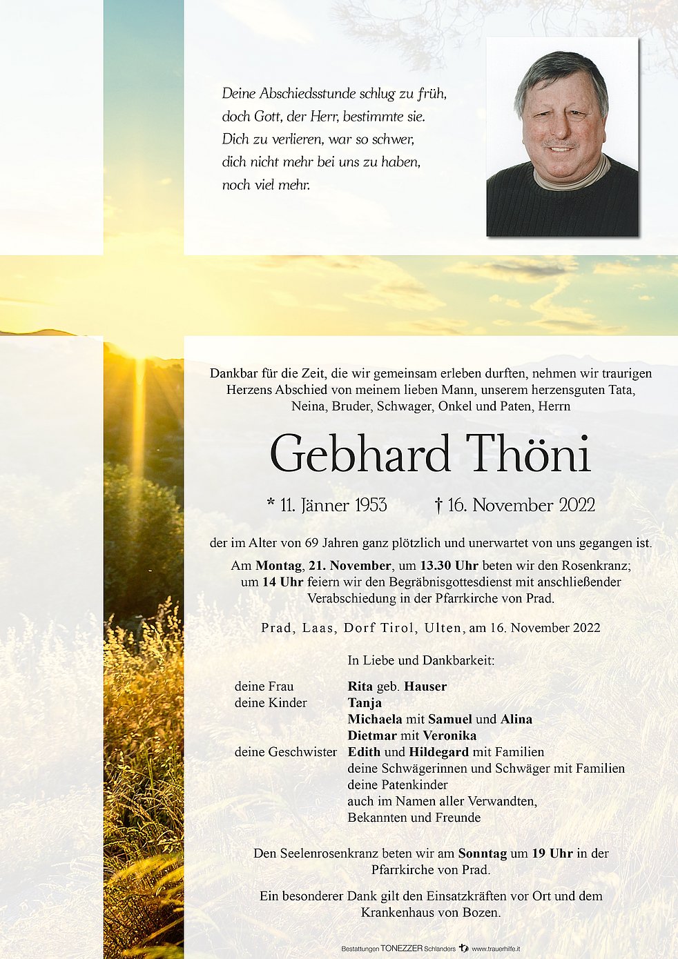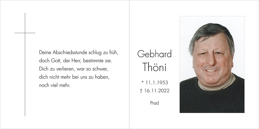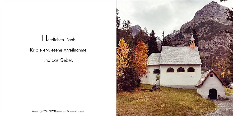 Am Montag, 21. November, um 13.30 Uhr beten wir den Rosenkranz; um 14 Uhr feiern wir den Begräbnisgottesdienst mit anschließender Verabschiedung in der Pfarrkirche von Prad.