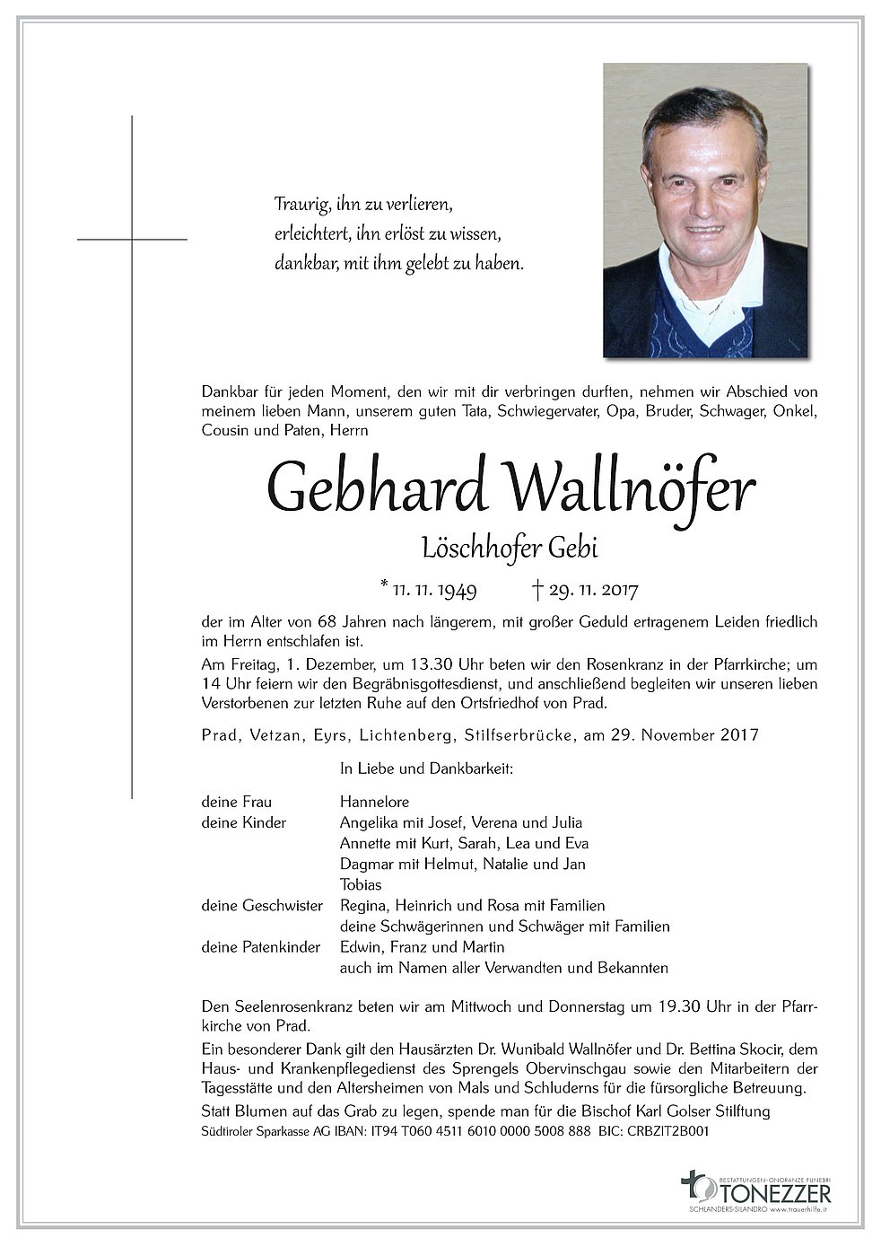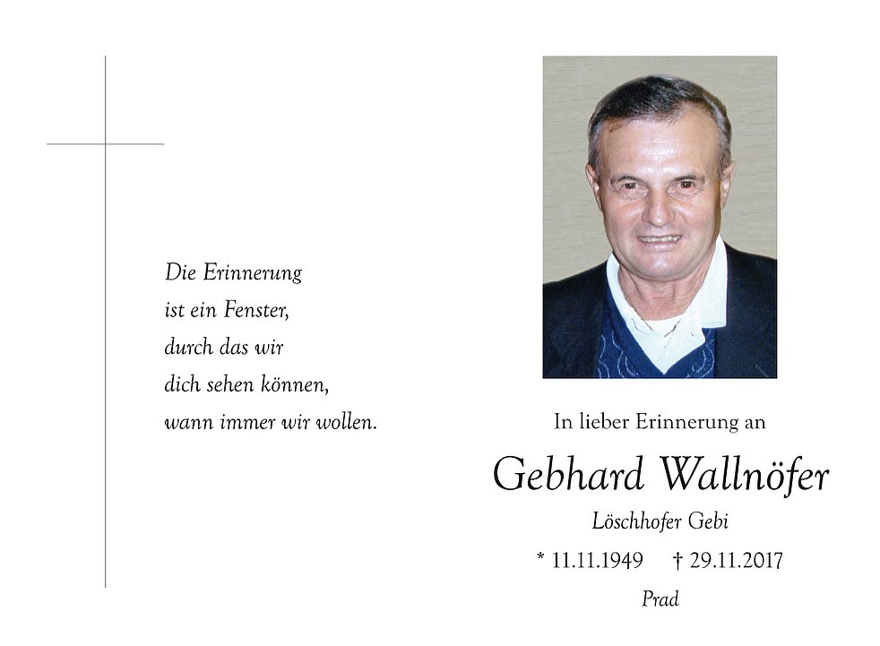 Am Freitag, 1. Dezember, um 13.30 Uhr beten wir den Rosenkranz in der Pfarrkirche; um 14 Uhr feiern wir den Begräbnisgottesdienst, und anschließend begleiten wir unseren lieben Verstorbenen zur letzten Ruhe auf den Ortsfriedhof von Prad.
