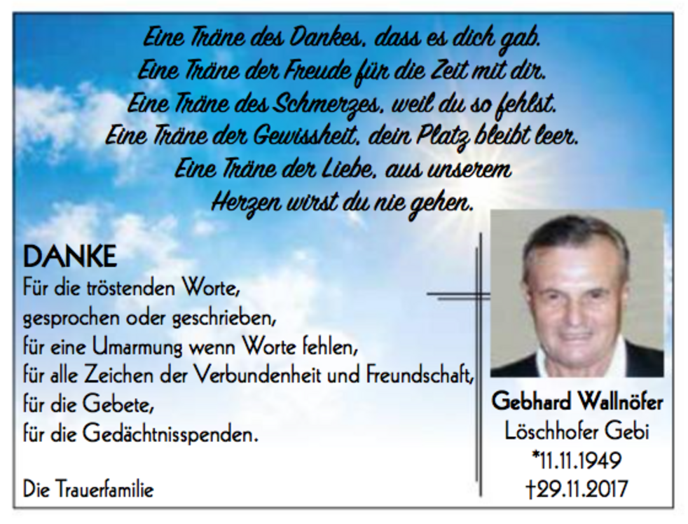 Dankbar für jeden Moment, den wir mit dir verbringen durften, nehmen wir Abschied von meinem lieben Mann, unserem guten Tata, Schwiegervater, Opa, Bruder, Schwager, Onkel, Cousin und Paten, Herrn