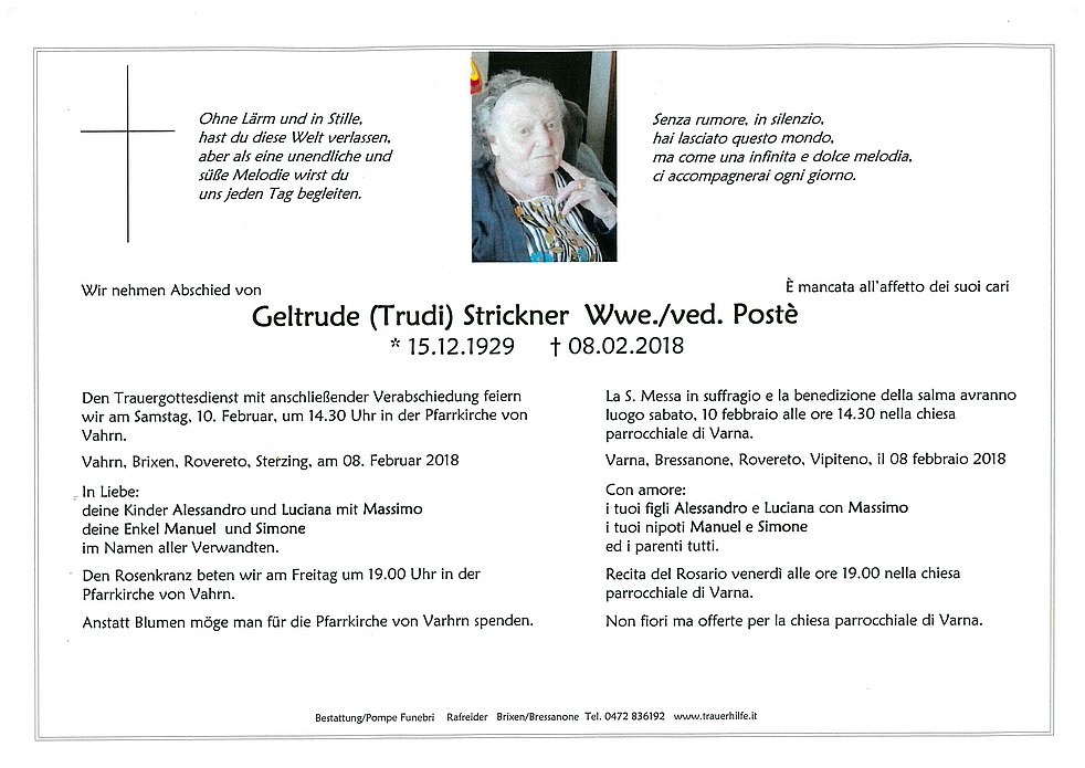 Den Trauergottesdienst mit anschließender Verabschiedung feiern wir am Samstag, 10. Februar, um 14.30 Uhr in der Pfarrkirche von Vahrn.
