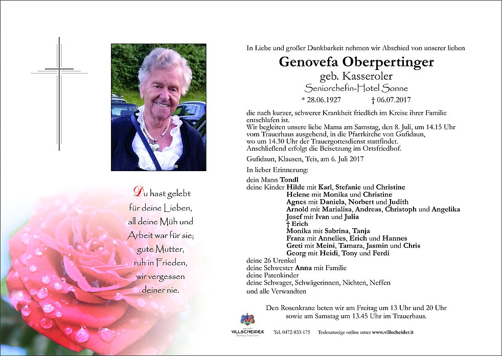 Wir begleiten unsere liebe Mama am Samstag, den 8. Juli, um 14.15 Uhr vom Trauerhaus ausgehend, in die Pfarrkirche von Gufidaun,