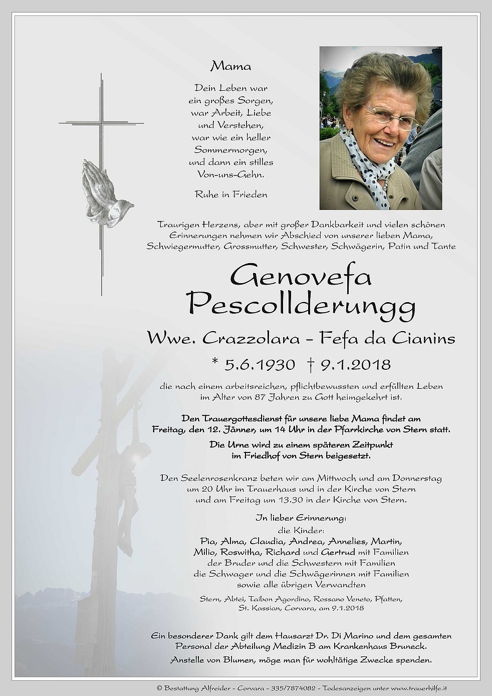 Den Trauergottesdienst für unsere liebe Mama findet am Freitag, den 12. Jänner, um 14 Uhr in der Pfarrkirche von Stern statt.