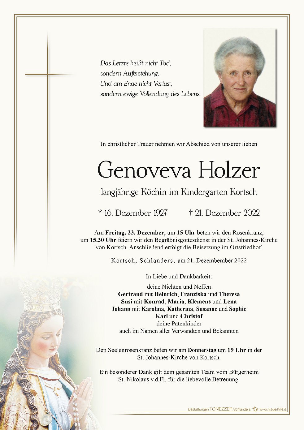 Am Freitag, 23. Dezember, um 15 Uhr beten wir den Rosenkranz; um 15.30 Uhr feiern wir den Begräbnisgottesdienst in der St. Johannes-Kirche von Kortsch.