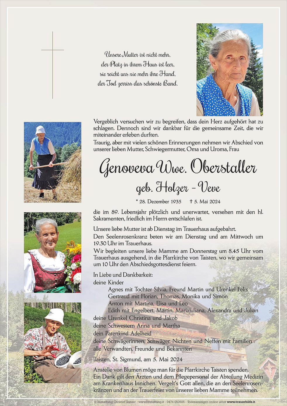 Wir begleiten unsere liebe Mamme am Donnerstag, 9. Mai, um 8.45 Uhr vom Trauerhaus ausgehend, in die Pfarrkirche von Taisten, wo wir gemeinsam um 10 Uhr den Abschiedsgottesdienst feiern.