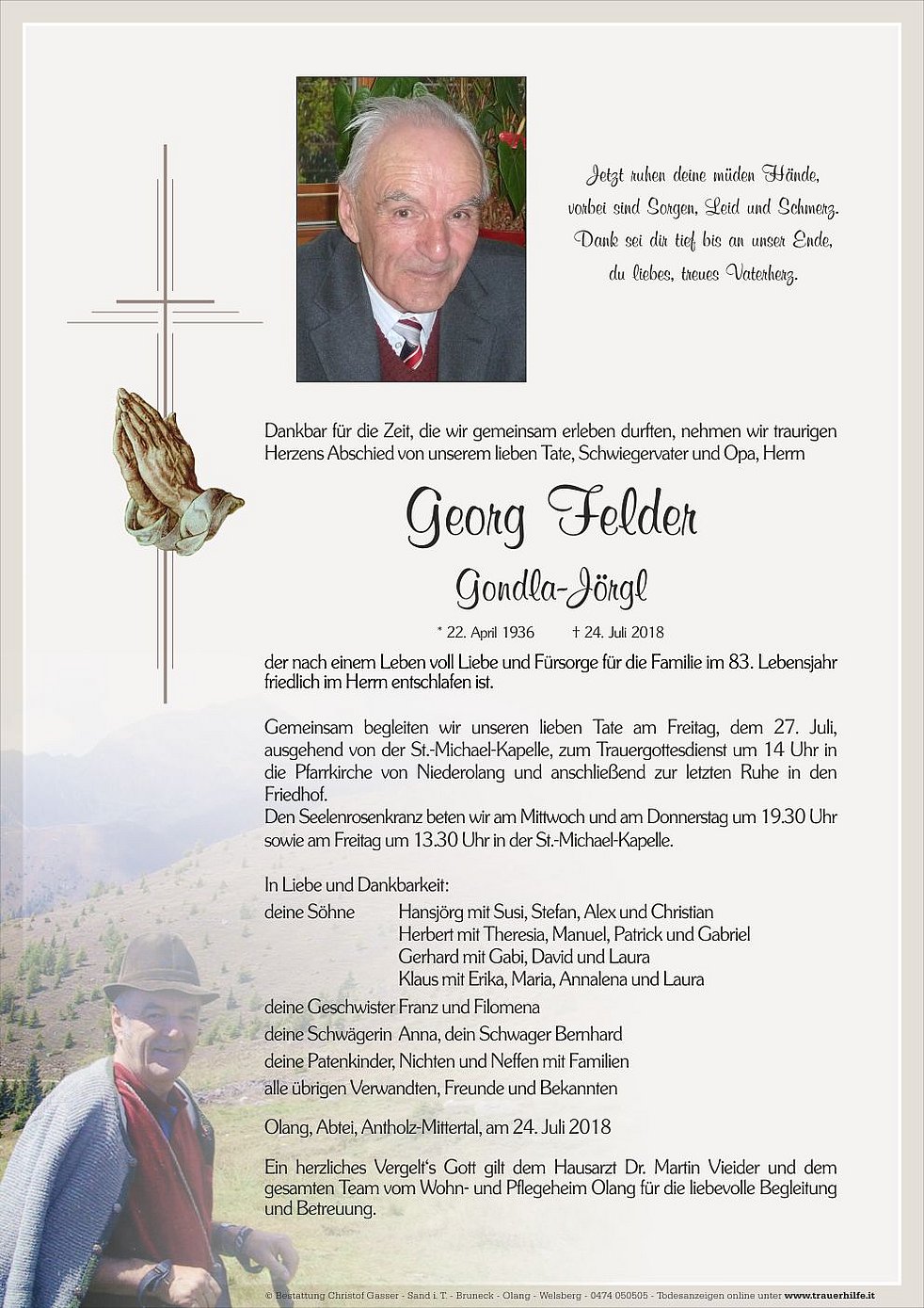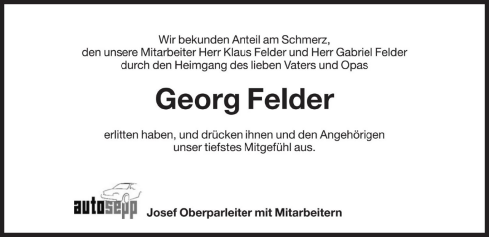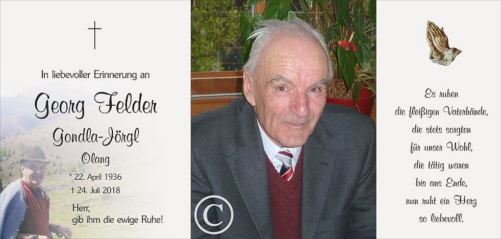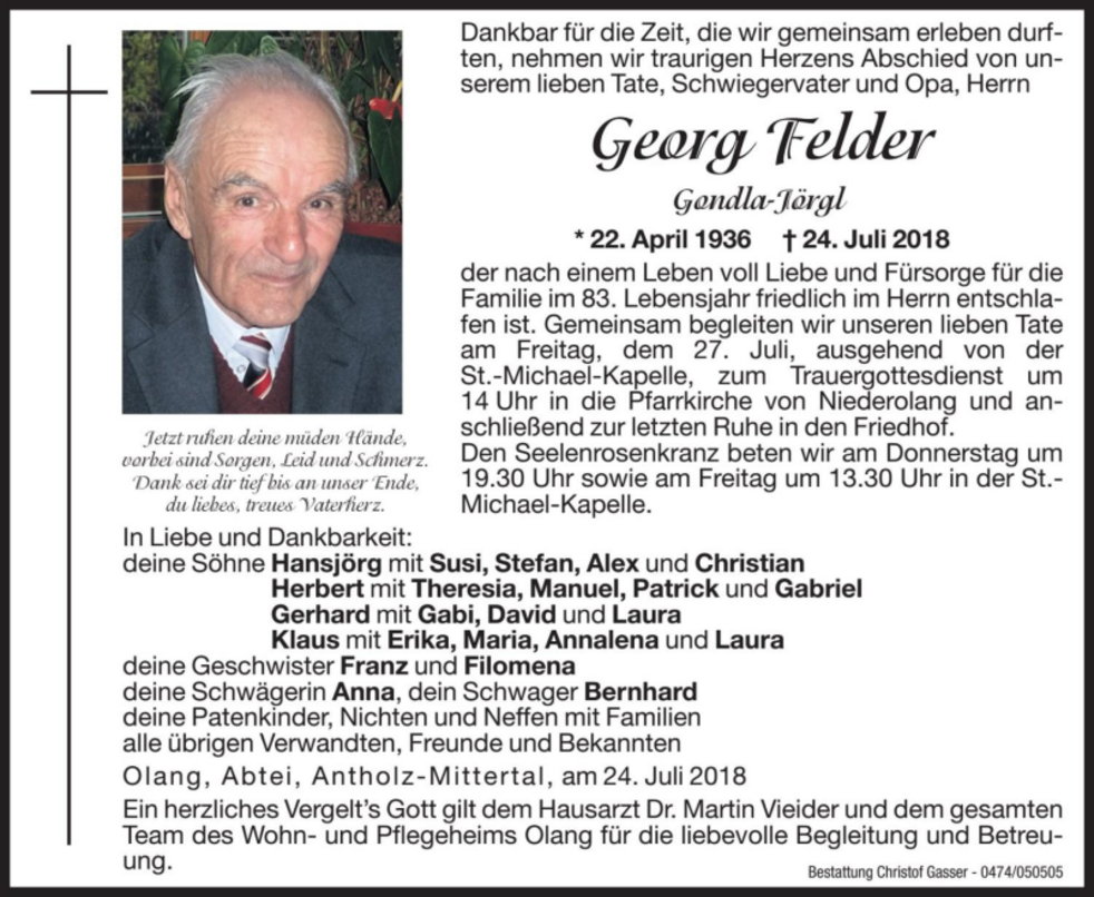 Gemeinsam begleiten wir unseren lieben Tate am Freitag, dem 27. Juli, ausgehend von der St.-Michael-Kapelle, zum Trauergottesdienst um 14 Uhr in die Pfarrkirche von Niederolang und anschließend zur letzten Ruhe in den Friedhof.