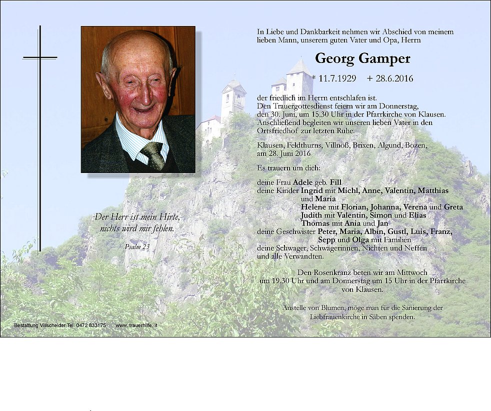den 30. Juni, um 15.30 Uhr in der Pfarrkirche von Klausen. Anschließend begleiten wir unseren lieben Vater in den Ortsfriedhof zur letzten Ruhe.