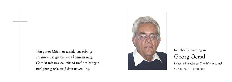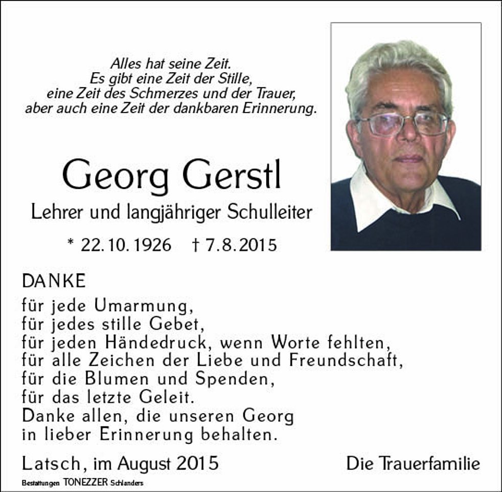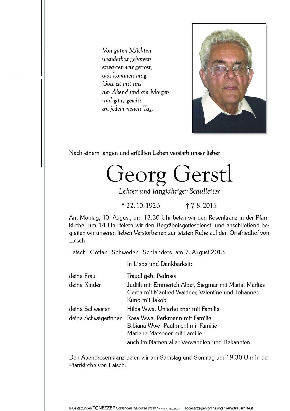 Am Montag, 10. August, um 13.30 Uhr beten wir den Rosenkranz in der Pfarrkirche; um 14 Uhr feiern wir den Begräbnisgottesdienst, und anschließend begleiten wir unseren lieben Verstorbenen zur letzten Ruhe auf den Ortsfriedhof von Latsch.