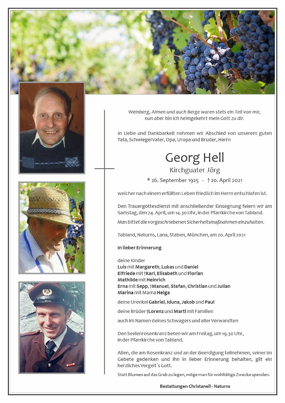 Den Trauergottesdienst mit anschließender Einsegnung feiern wir am Samstag, den 24. April, um 14.30 Uhr, in der Pfarrkirche von Tabland.