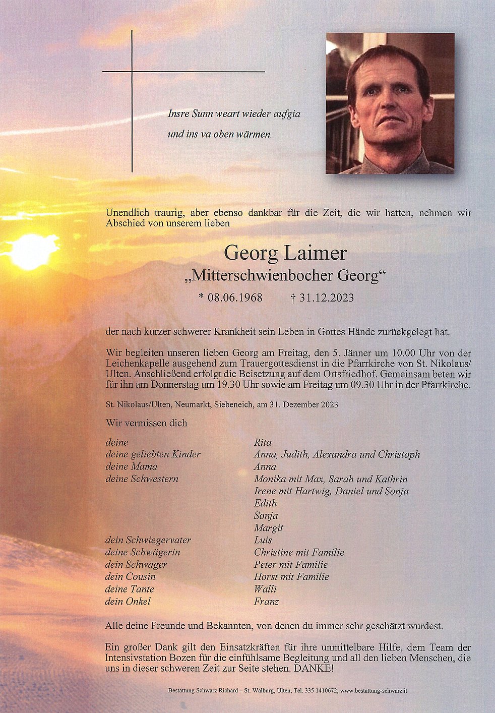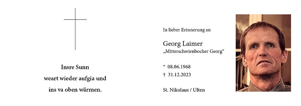 Wir begleiten unseren lieben Georg am Freitag, den 5. Jänner um 10.00 Uhr von der Leichenkapelle ausgehend zum Trauergottesdienst in die Pfarrkirche von St. Nikolaus/ Ulten. Anschließend erfolgt die Beisetzung auf dem Ortsfriedhof. Gemeinsam beten wir für ihn am Donnerstag um 19.30 Uhr sowie am Freitag um 09.30 Uhr in der Pfarrkirche.
