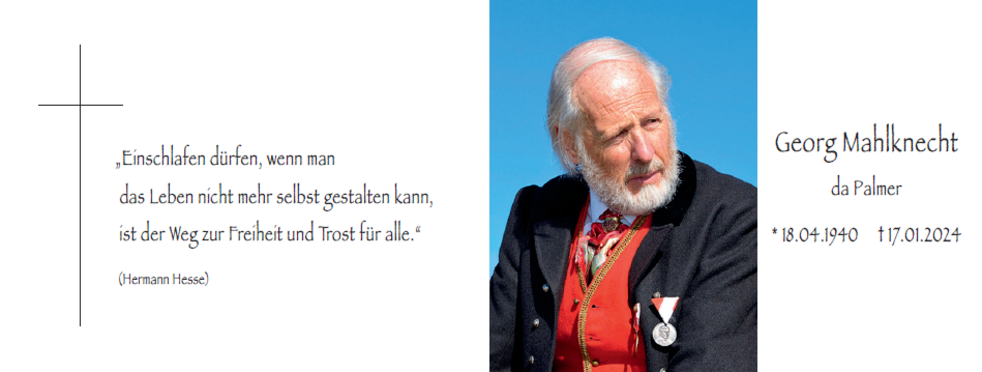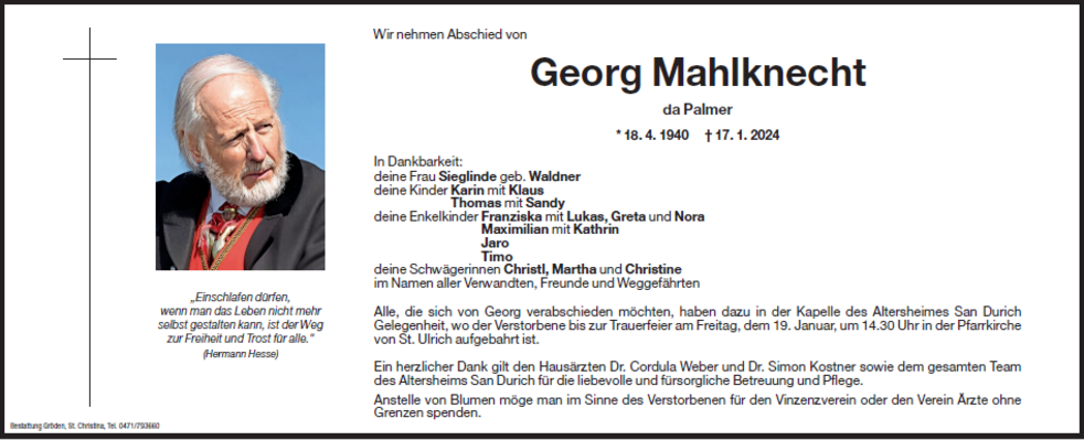 Alle, die sich von Georg verabschieden möchten, haben dazu in der Kapelle des Altersheimes San Durich Gelegenheit, wo der Verstorbene bis zur Trauerfeier am Freitag, dem 19. Januar, um 14.30 Uhr in der Pfarrkirche von St. Ulrich aufgebahrt ist.