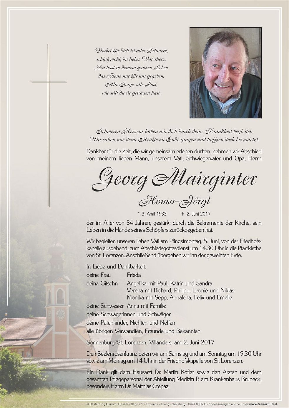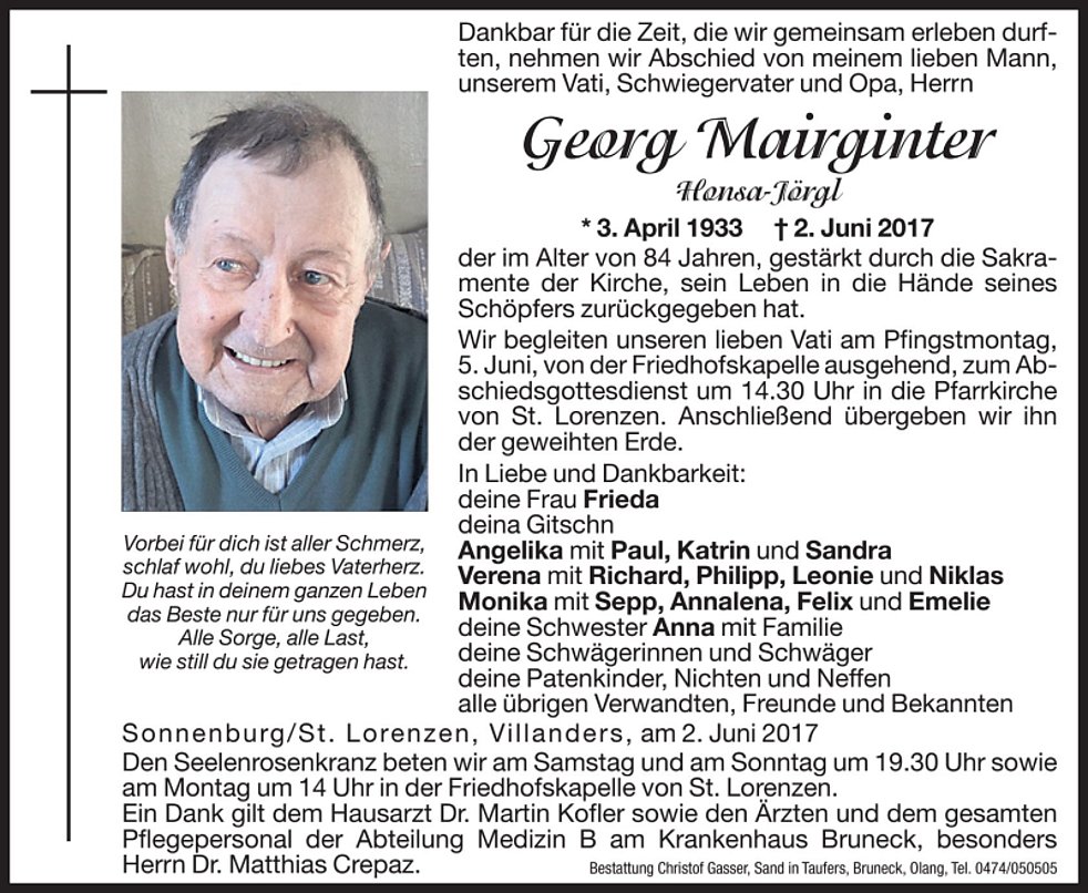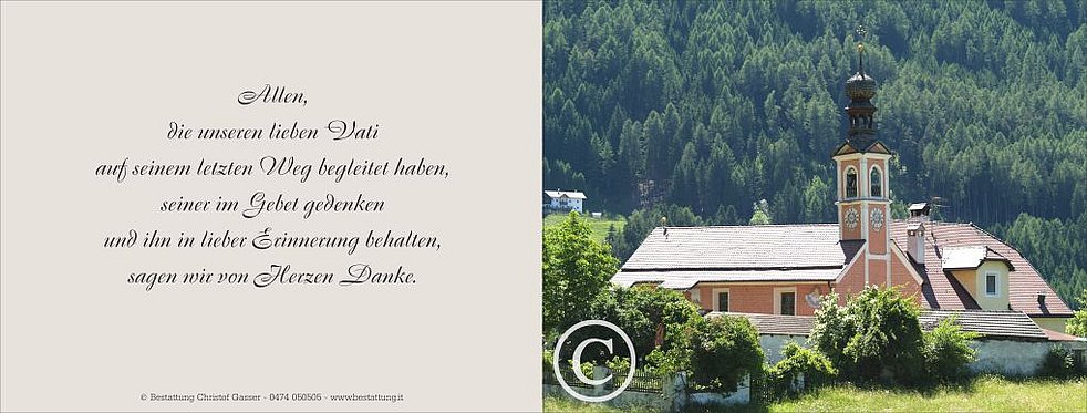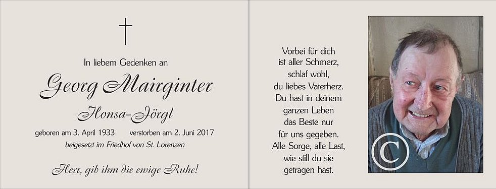 Wir begleiten unseren lieben Vati am Pfingstmontag, 5. Juni, von der Friedhofs-kapelle ausgehend, zum Abschiedsgottesdienst um 14.30 Uhr in die Pfarrkirche von St. Lorenzen. Anschließend übergeben wir ihn der geweihten Erde.