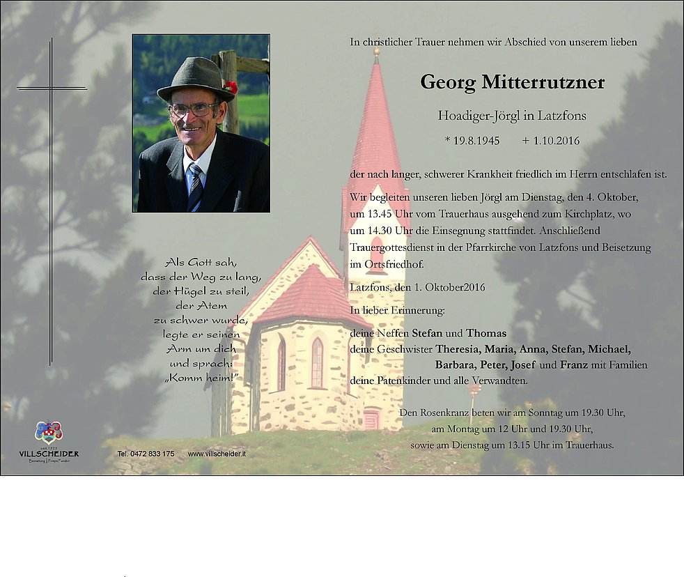um 14.30 Uhr die Einsegnung stattfindet. Anschließend Trauergottesdienst in der Pfarrkirche von Latzfons und Beisetzung