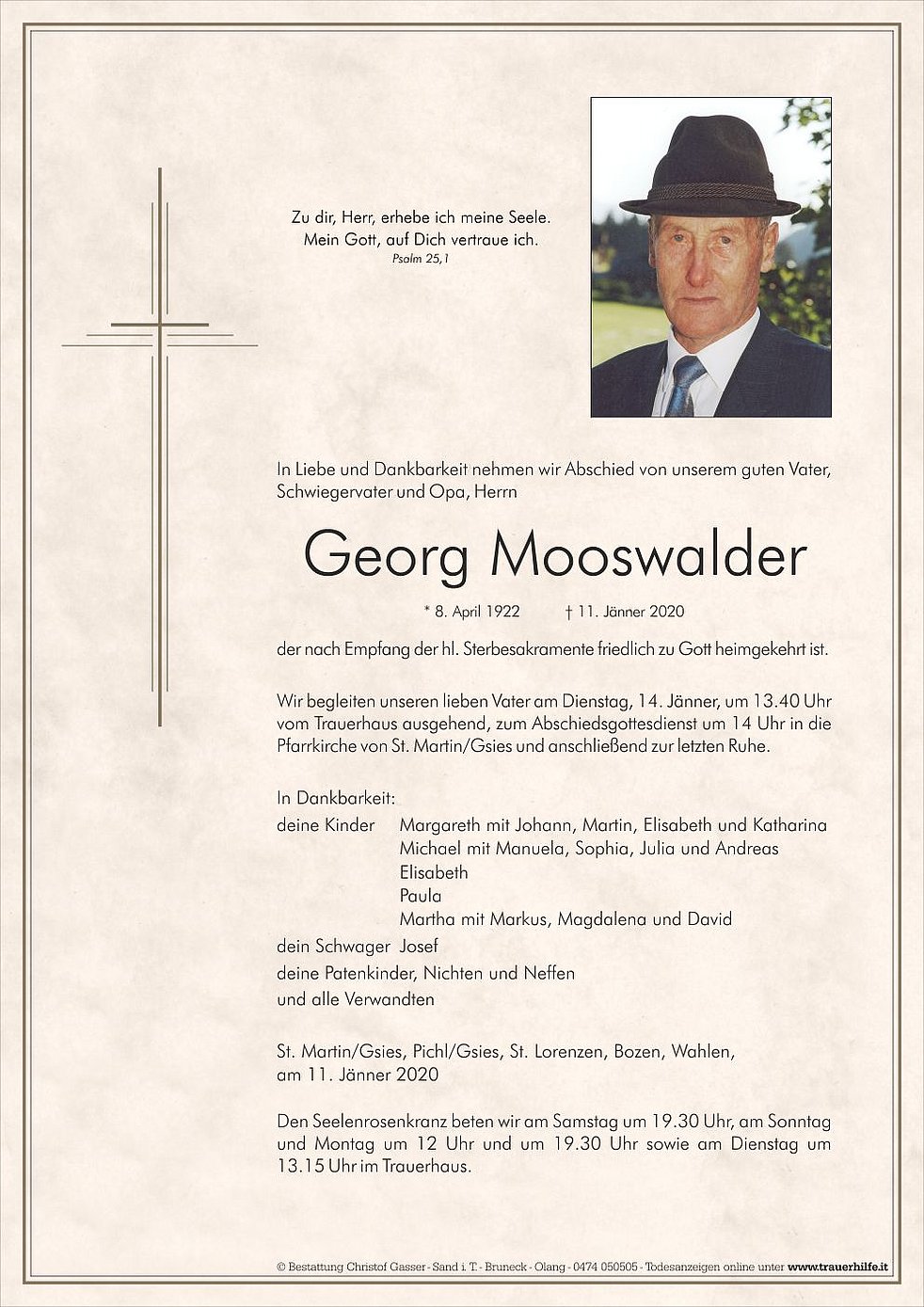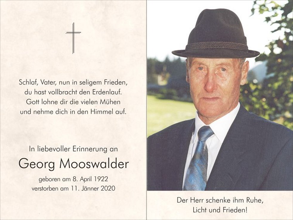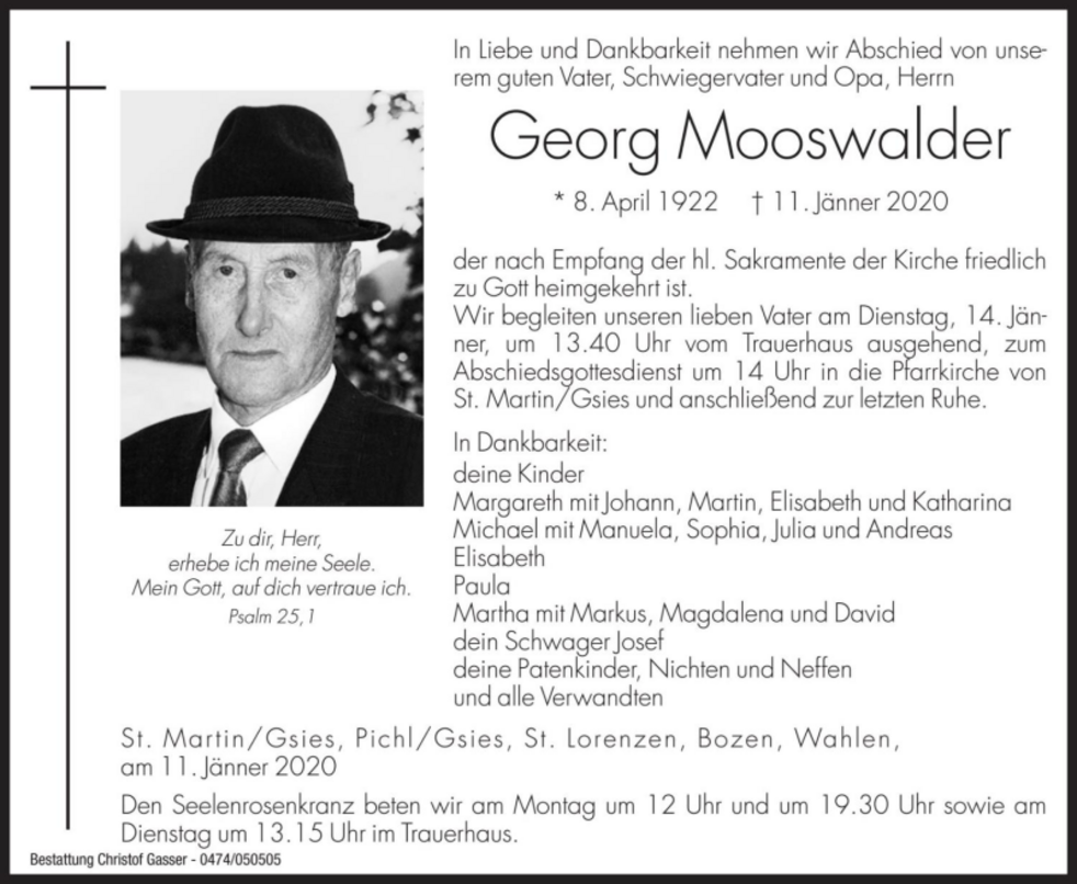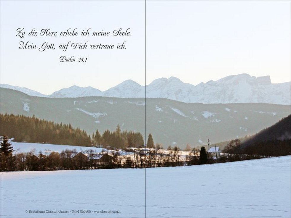 Wir begleiten unseren lieben Vater am Dienstag, 14. Jänner, um 13.40 Uhr vom Trauerhaus ausgehend, zum Abschiedsgottesdienst um 14 Uhr in die Pfarrkirche von St. Martin/Gsies und anschließend zur letzten Ruhe.