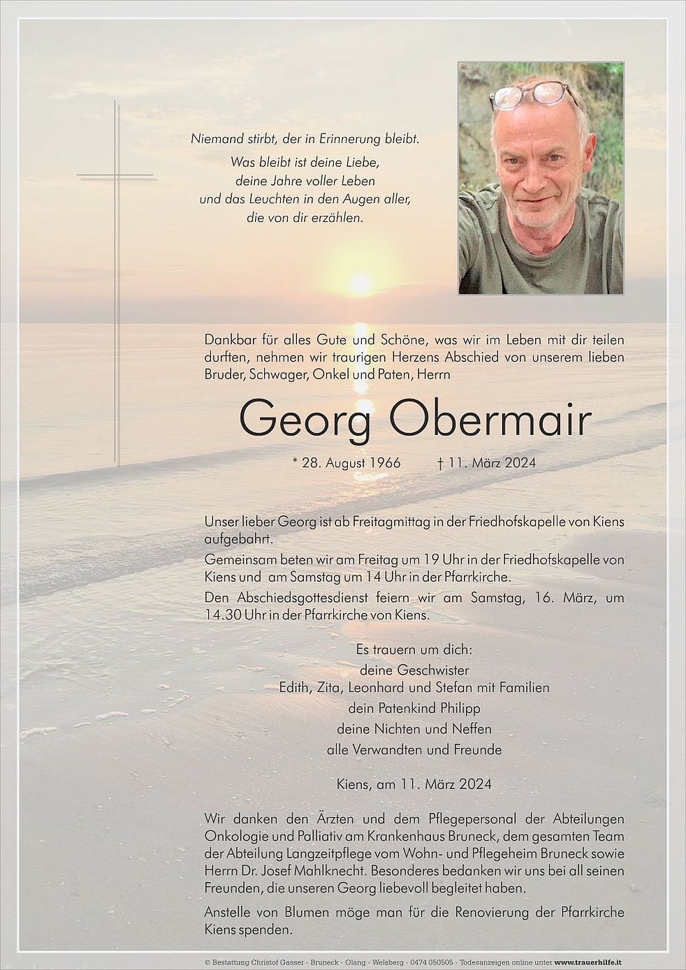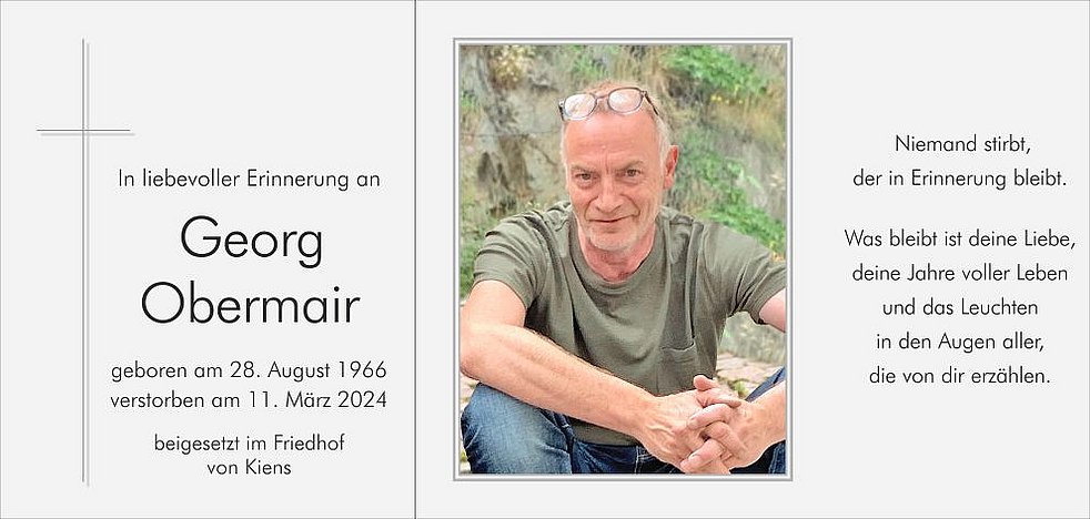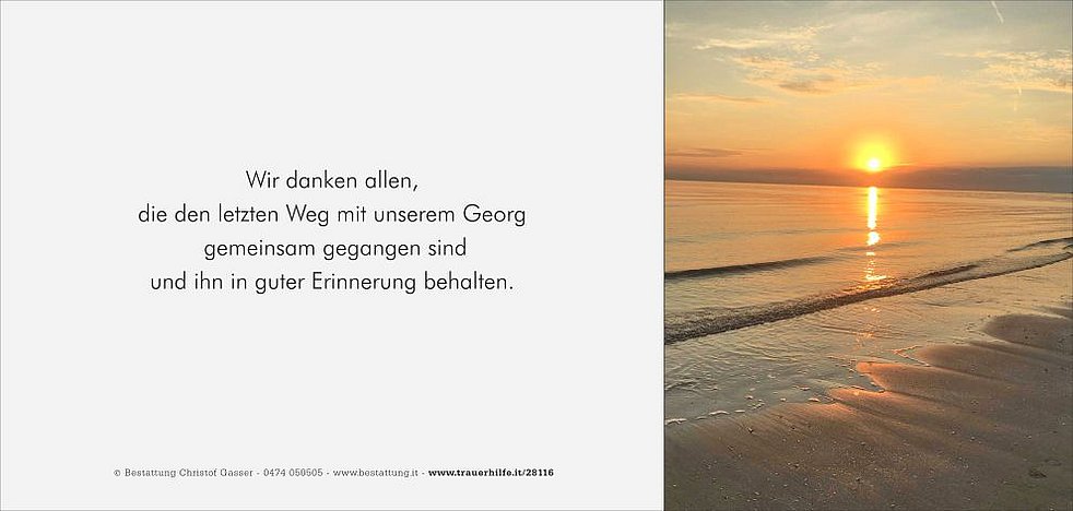 Wir danken den Ärzten und dem Pflegepersonal der Abteilungen Onkologie und Palliativ am Krankenhaus Bruneck, dem gesamten Team der Abteilung Langzeitpflege vom Wohn- und Pflegeheim Bruneck sowie Herrn Dr. Josef Mahlknecht. Besonderes bedanken wir uns bei all seinen Freunden, die unseren Georg liebevoll begleitet haben.