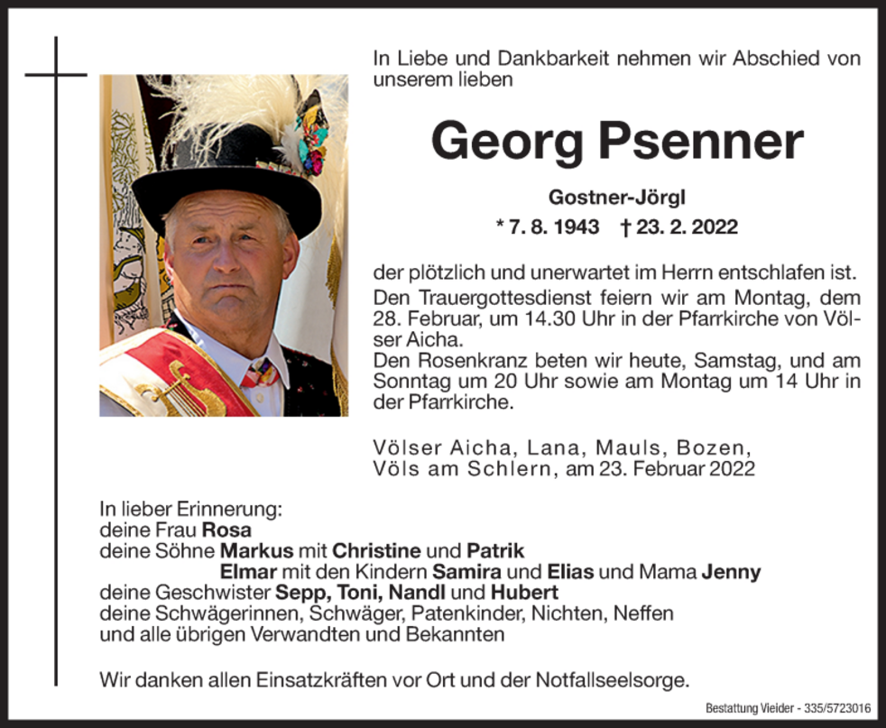 Den Trauergottesdienst feiern wir am Montag, dem 28. Februar, um 14.30 Uhr in der Pfarrkirche von Völser Aicha.